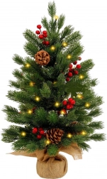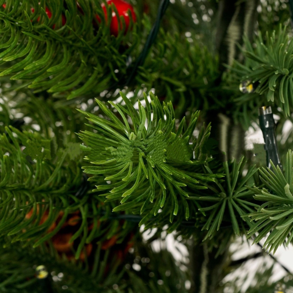 Zintegrowane łańcuchy świetlne LED z 3 trybami świecenia zapewniają delikatne ciepłe światło. Elastyczna konstrukcja gałązek umożliwia łatwe formowanie, a dekor z czerwonych jagód i szyszek dodaje naturalnego, klasycznego wyglądu. Dociążona podstawa owinięta jutą stabilnie trzyma choinkę i podkreśla rustykalny styl.