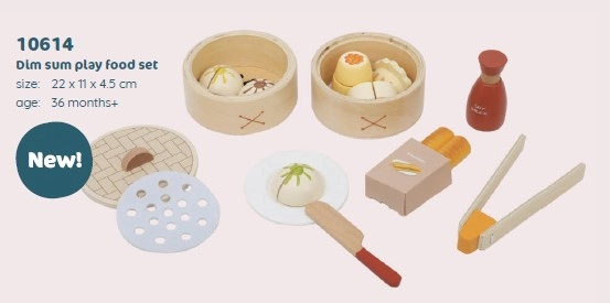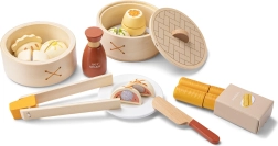 Ten drewniany zestaw dim sum wprowadza do dziecięcego pokoju autentyczną atmosferę kuchni azjatyckiej. Dzieci mogą „parować” pierożki w piętrowych koszyczkach, podawać je na talerzu i doprawiać „sosem sojowym”. Pałeczki i nóż pomagają ćwiczyć chwyt, koordynację i zręczność.
