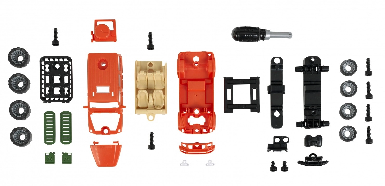 Zestaw samochodu MERCEDES-BENZ klasy G zapewnia dzieciom autentyczne doświadczenie montażu. Elementy karoserii, podwozia i akcesoriów łączą się za pomocą śrubek i dołączonego śrubokręta, dzięki czemu mali technicy poznają, jak działa auto, a jednocześnie rozwijają koordynację oko–ręka, cierpliwość i logiczne myślenie.
