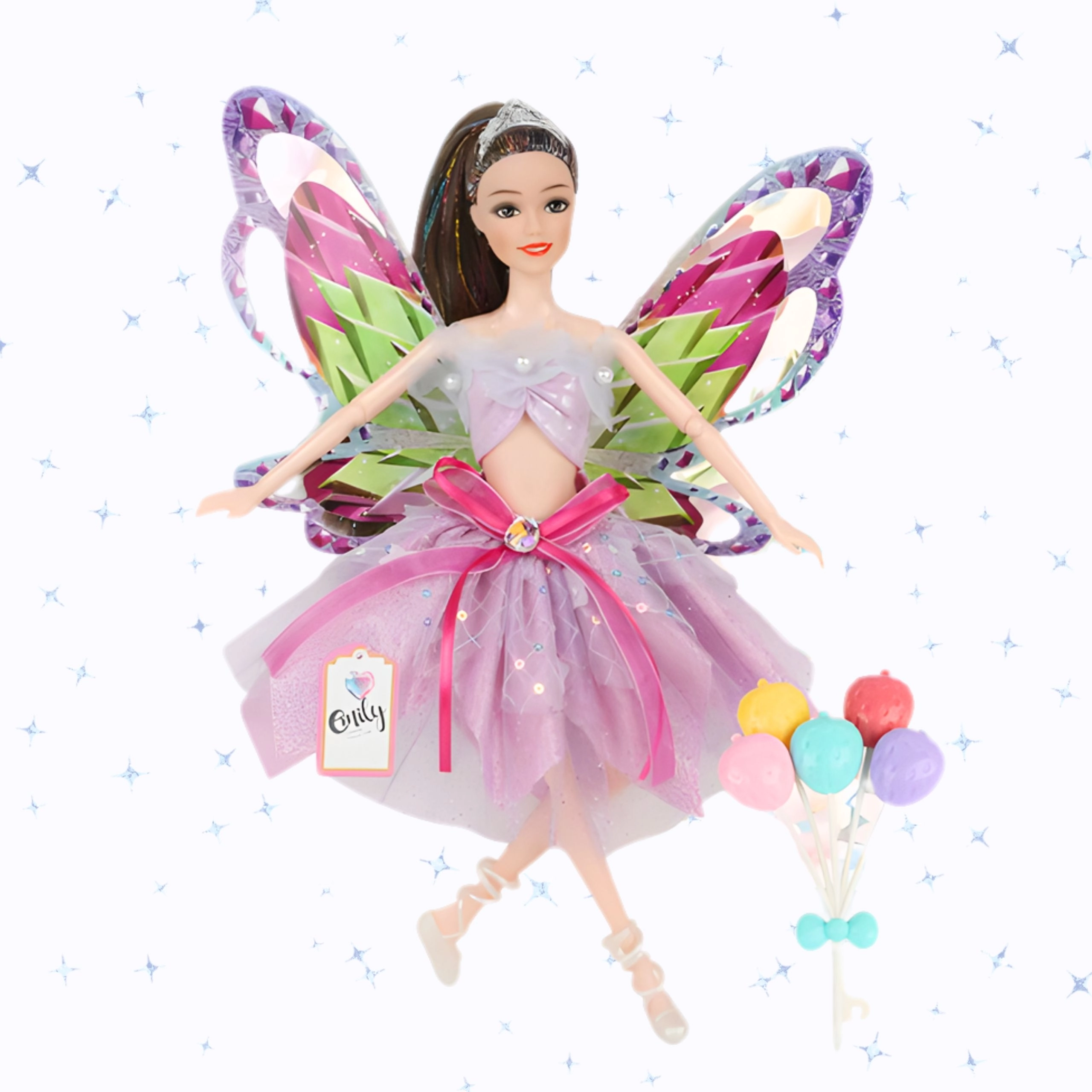 - lalka Emi w stroju wróżki, 2 spinki do włosów, zestaw kolorowych baloników