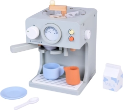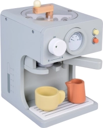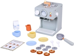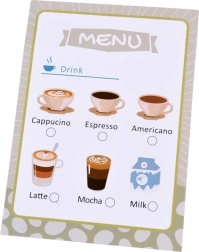 W zestawie komplet dodatków: kubeczki z podstawkami i łyżeczkami, dzbanuszek, kartonik „mleka”, drewniane monety oraz żetony latte art do kreatywnego zdobienia. Dzieci mogą według menu przygotować espresso, cappuccino, latte lub americano i obsłużyć rodzinę oraz przyjaciół – jak w prawdziwej kawiarni.