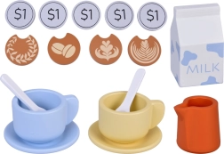 Dwie filiżanki z podstawkami i łyżeczkami, dzbanuszek, kartonik „mleka”, żetony latte art, monety i karta menu do składania zamówień.