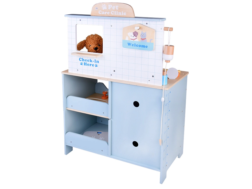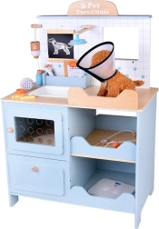 Drewniana klinika weterynaryjna dla dzieci oferuje wszystko, czego mali miłośnicy zwierząt potrzebują do opieki nad swoimi pluszowymi pacjentami. Solidna, drewniana konstrukcja z zaokrąglonymi krawędziami i nietoksycznymi farbami zapewnia bezpieczną zabawę, a przemyślane elementy – zlew, półki, okienko przyjęć, tablica i przegrody na akcesoria – sprawiają, że zabawa jest autentyczna i uporządkowana.