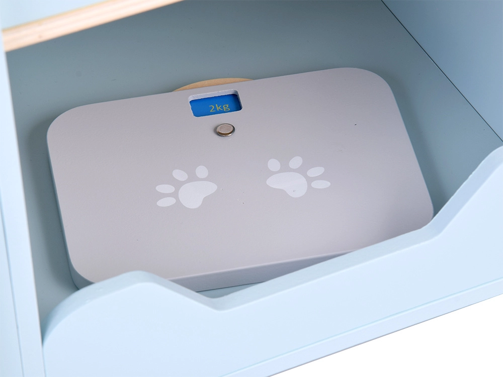 Stolik ze zlewem, półkami, okienkiem przyjęć, „kennelem” z drzwiczkami oraz tablicą tworzą autentyczne środowisko do zabawy.