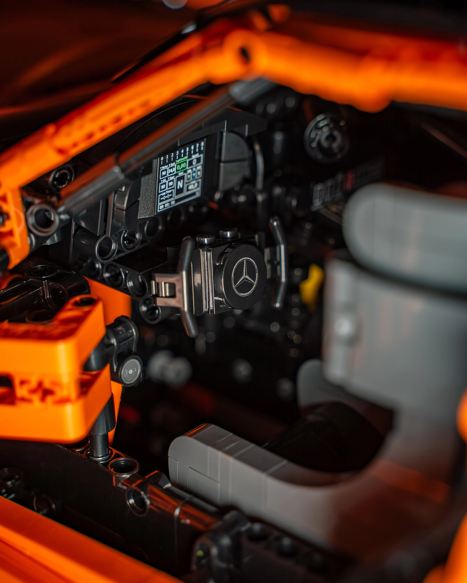 Wyposażenie techniczne zachwyci każdego miłośnika inżynierii: 8‑biegowa skrzynia z realnym przeniesieniem ruchu, niezależne przednie i tylne zawieszenie z regulowanymi amortyzatorami, połączony układ kierowniczy z kierownicą oraz otwierane i blokowane drzwi. W zestawie znajduje się także układ pneumatyczny do podnoszenia auta jak podczas prawdziwego pit-stopu oraz specjalne akcesoria do wymiany kół.