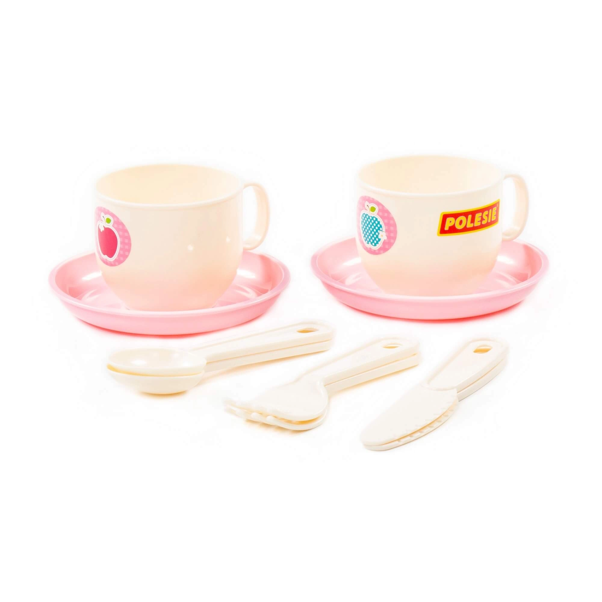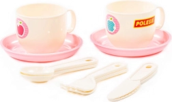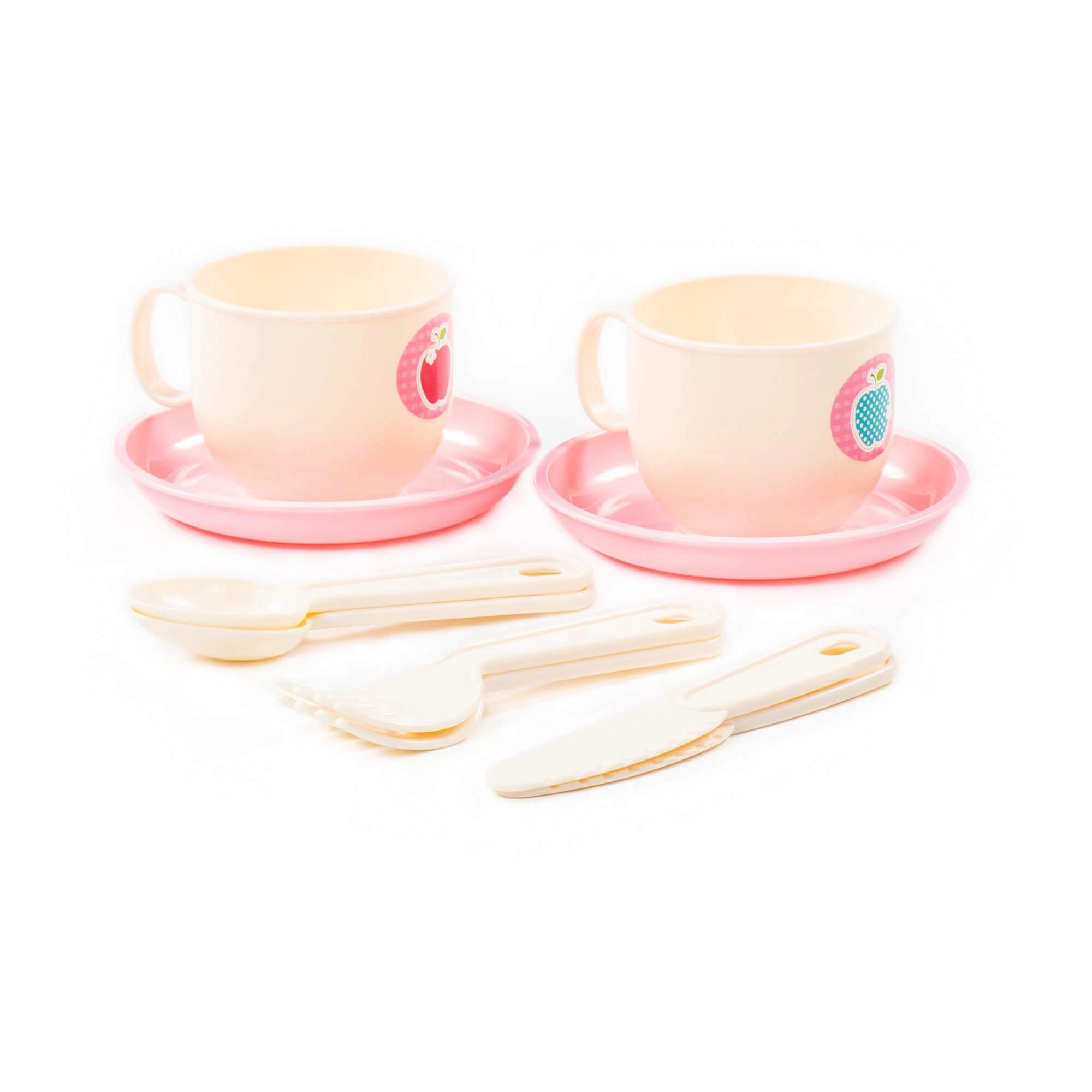 Dwie filiżanki z różowymi spodkami i sztućcami pozwolą dzieciom serwować jak prawdziwi gospodarze.