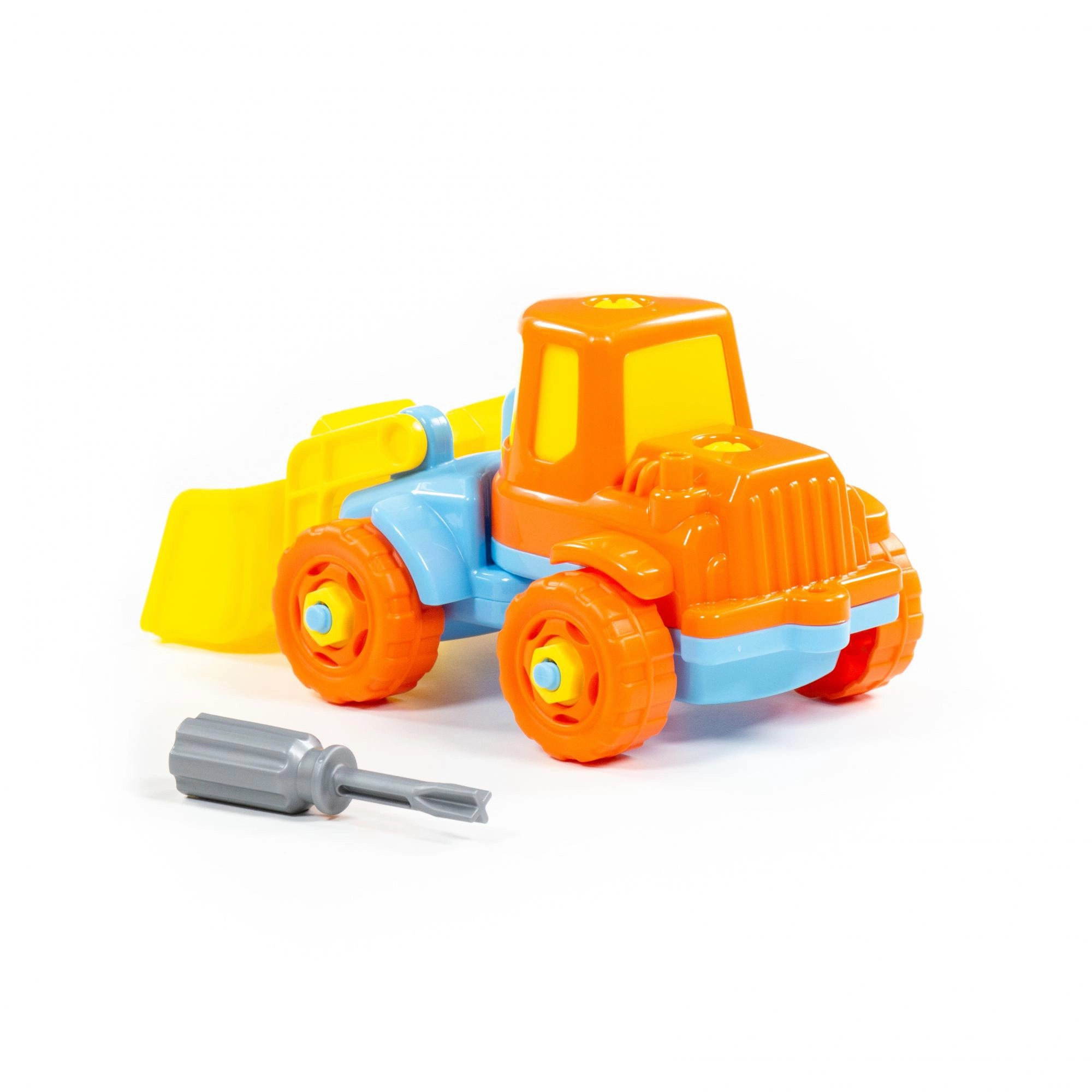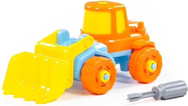 W zestawie znajduje się prosty dziecięcy śrubokręt – dzieci mogą rozkręcać i ponownie składać koparkę, trenując motorykę małą i cierpliwość.