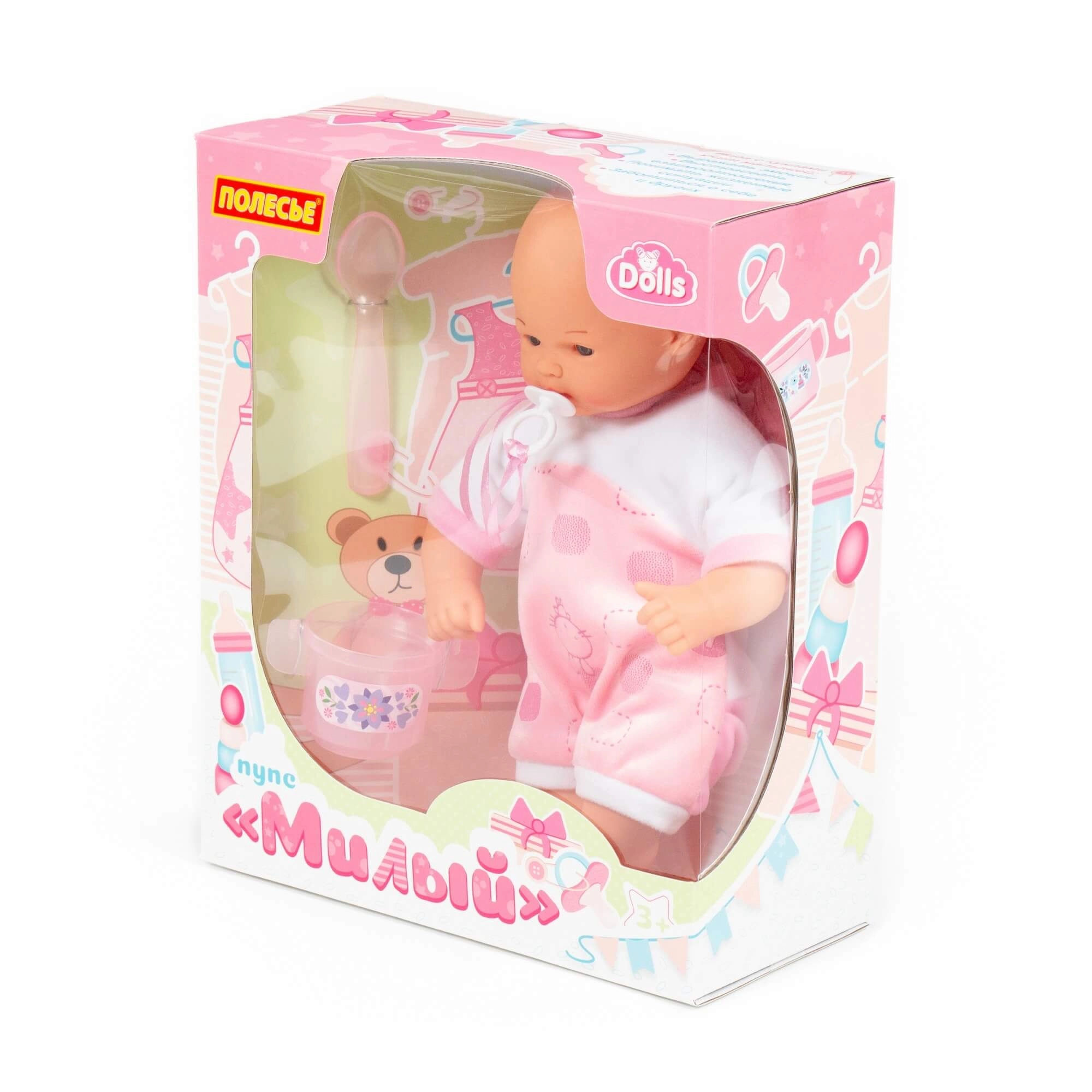 Laleczka ma na stałe otwarte oczy, dzięki czemu wygląda żywo i słodko. Miękkie, wypełnione ciałko jest przyjemne w dotyku i odpowiednie do przytulania oraz codziennej zabawy.