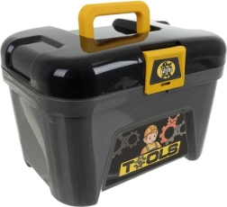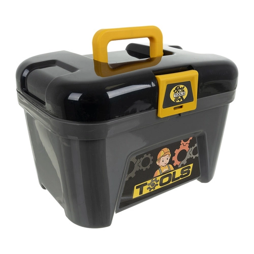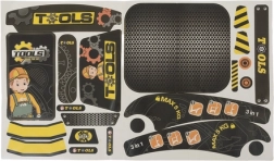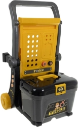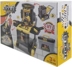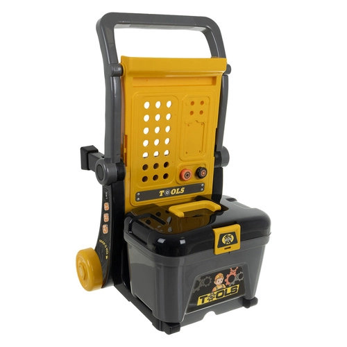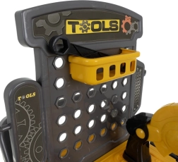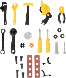 - walizka na narzędzia, elementy do złożenia warsztatu/wózka/taczki, perforowana tablica, 2 boczne organizery, piła z ruchomym ostrzem, śrubki i nakrętki, 2 śrubokręty z wymiennymi bitami, klucze (francuski, oczkowy, nastawny, nasadowy), szczypce, młotek, płytki do przykręcania, koła zębate, haczyki i akcesoria, instrukcja