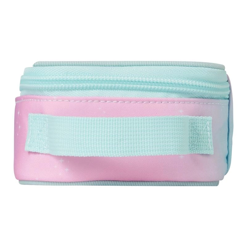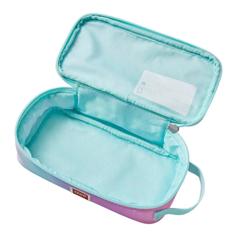 Elegancki, prostokątny piórnik LEGO w połączeniu pastelowego różu i mięty jest idealny do szkoły, przedszkola i do domowego tworzenia. Oferuje przejrzyste przechowywanie artykułów piśmienniczych i drobiazgów, niezawodny zamek dookoła oraz boczną pętelkę dla wygodnego noszenia.