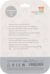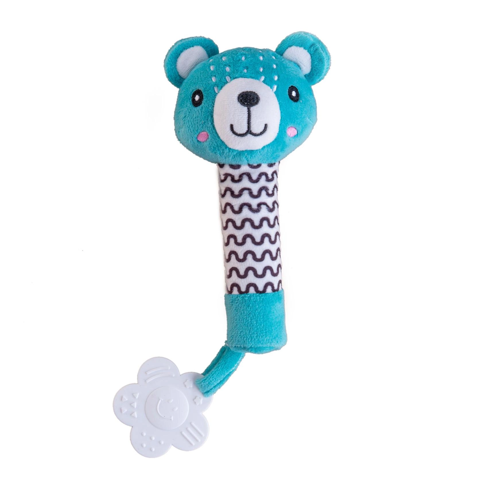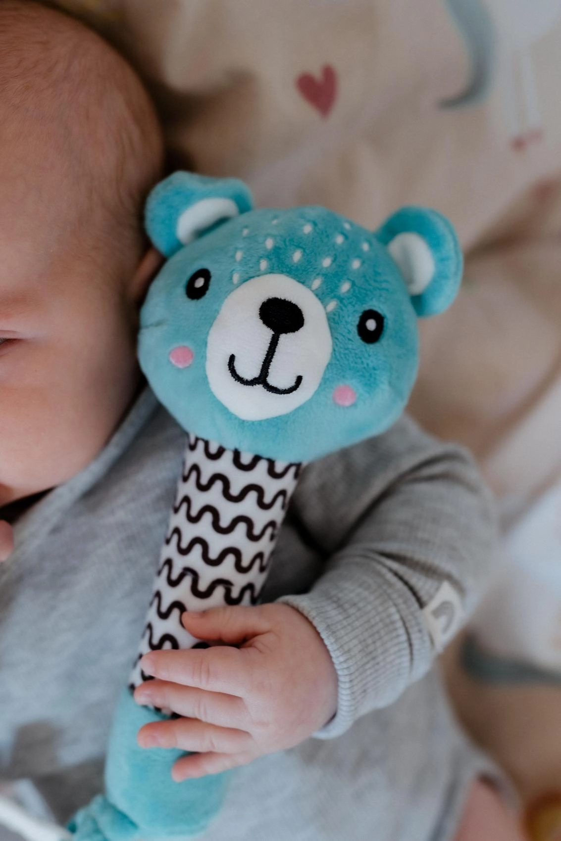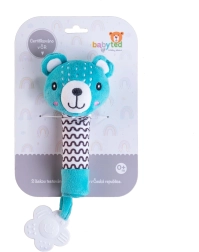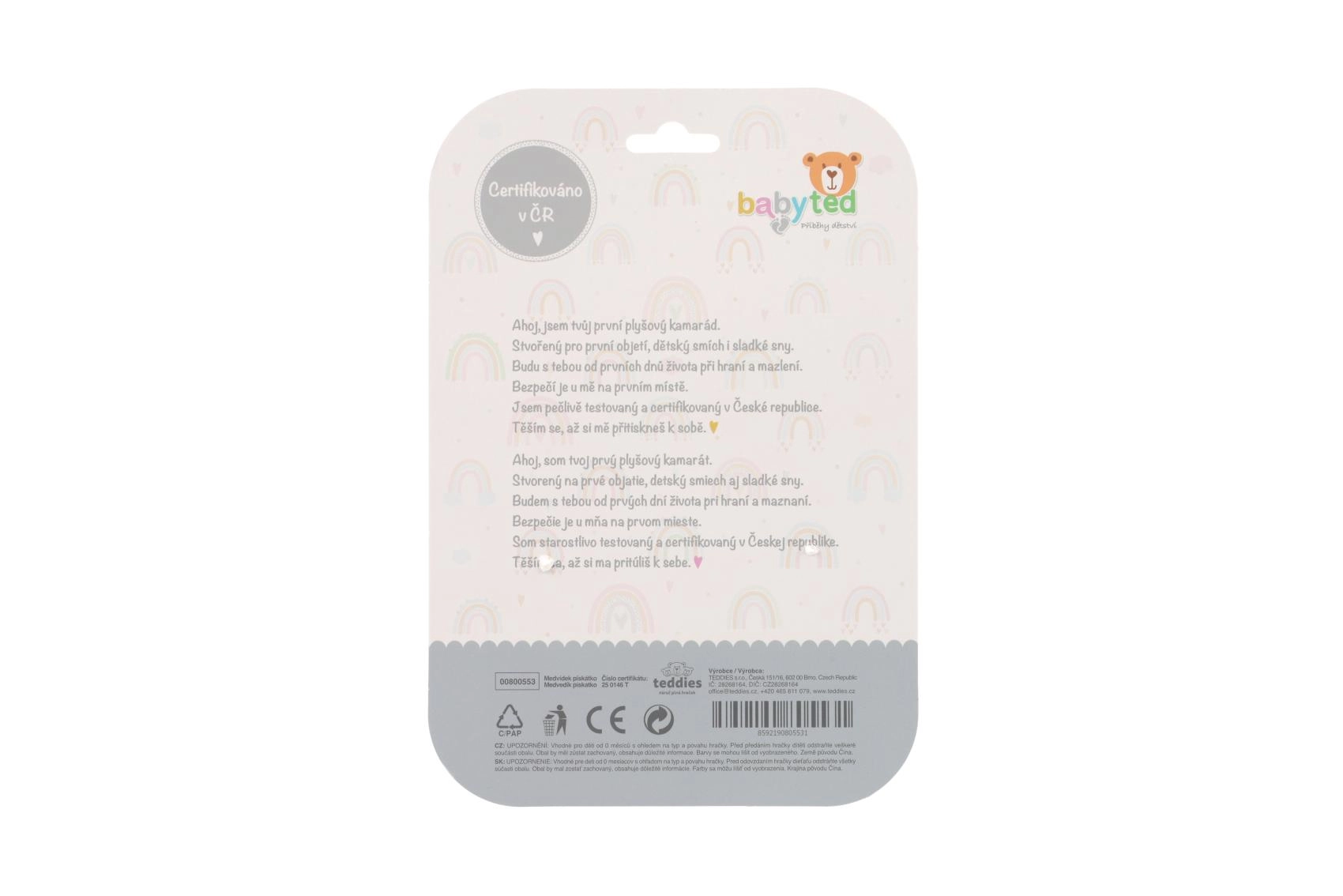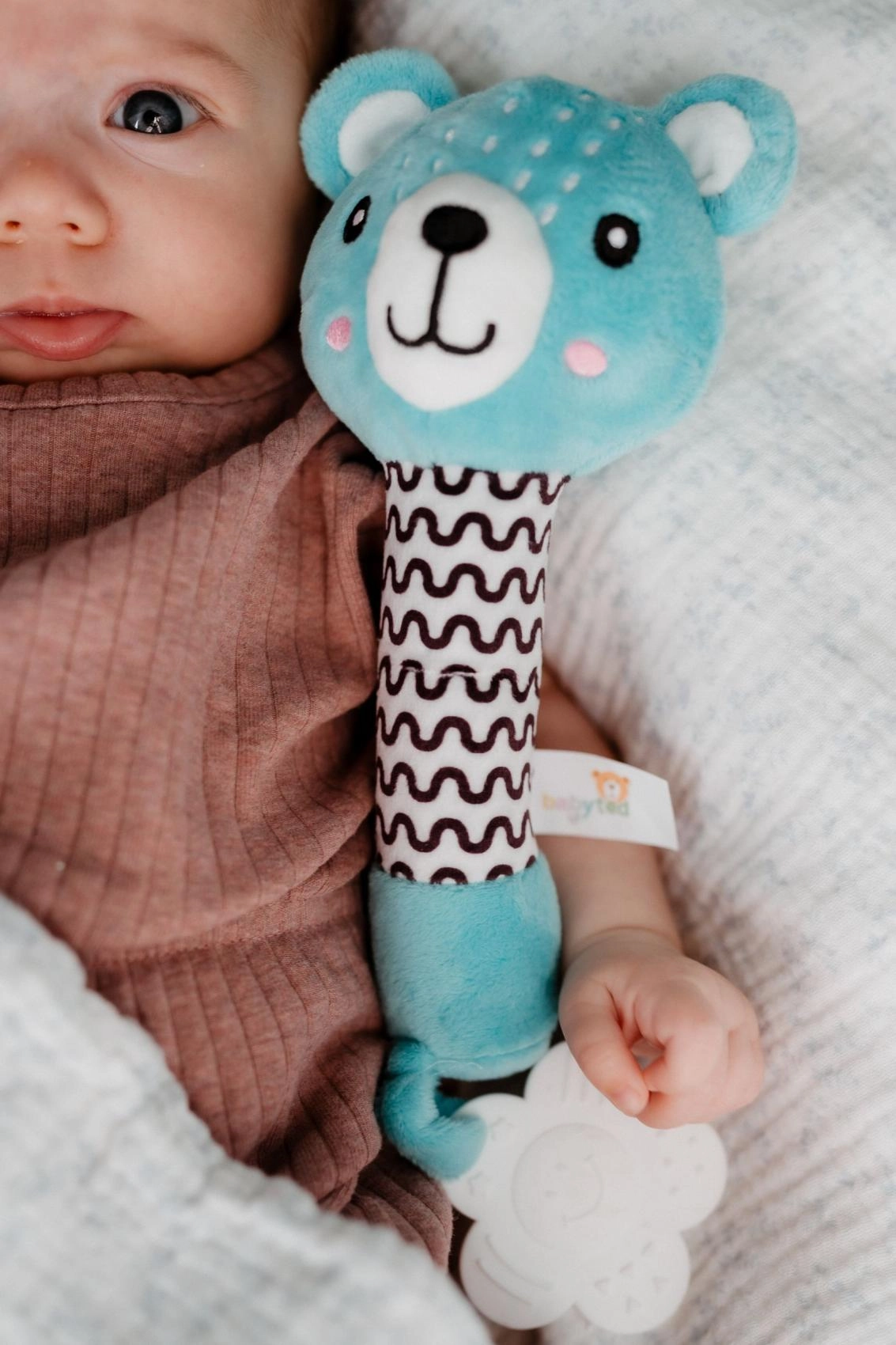 Urocza pluszowa grzechotka z misiem od BABYTED to idealna pierwsza zabawka dla maluszków od 0 m+. Dzięki długiemu miękkiemu uchwytowi świetnie leży w małych rączkach, po naciśnięciu delikatnie piszczy i rozwija percepcję słuchową. Na końcu znajduje się miękki gryzak w kształcie kwiatuszka, który przynosi ulgę wrażliwym dziąsłom. Mięciutki, bezpieczny plusz oraz kontrastowe wzory wspierają wzrok i rozwój sensoryczny. Zabawka jest certyfikowana w Czechach i spełnia rygorystyczne normy bezpieczeństwa.