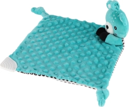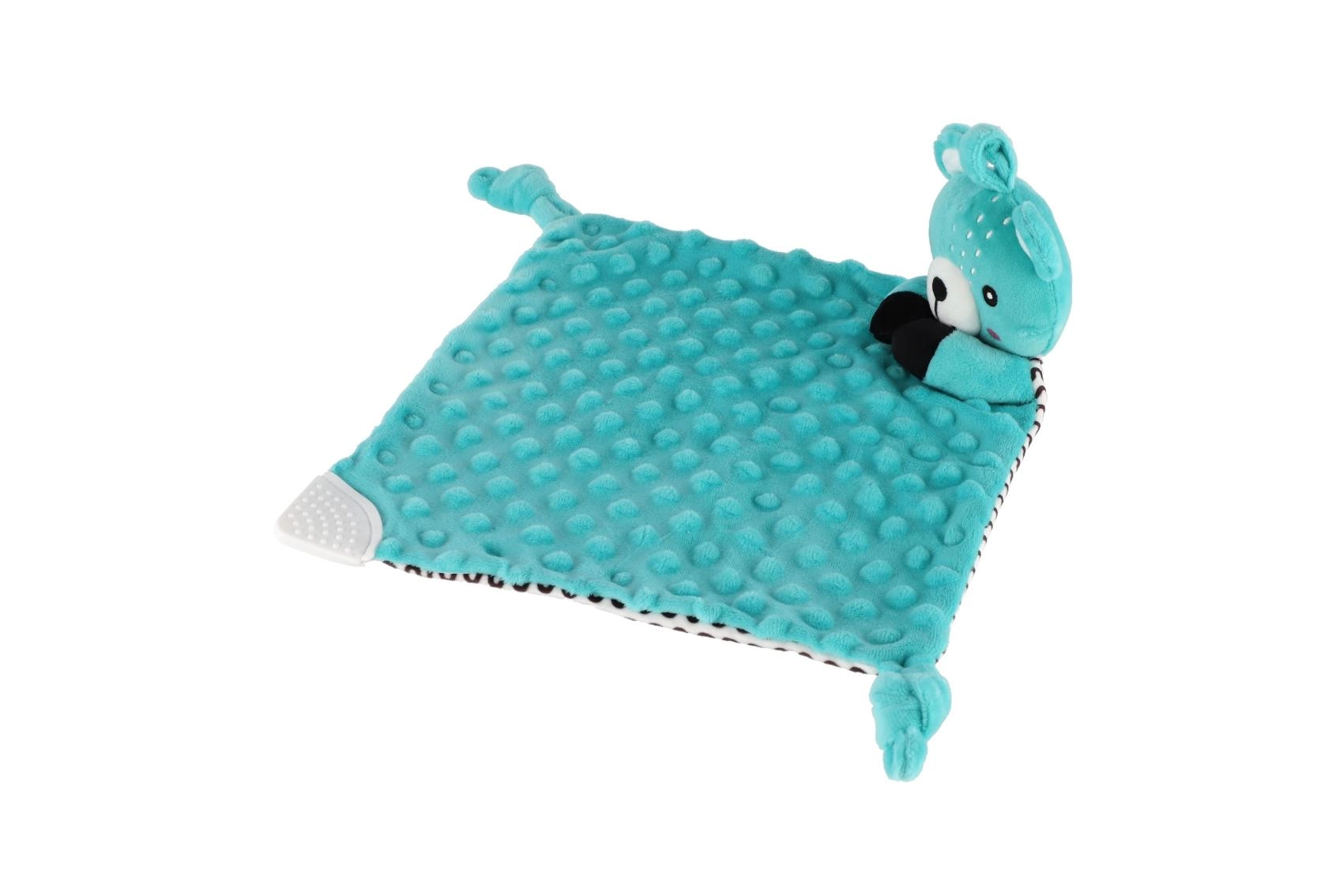 Miękki gryzak w rogu kocyka pomaga ukoić wrażliwe dziąsła podczas ząbkowania, bezpieczny dla dzieci od urodzenia.