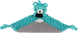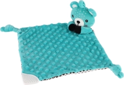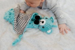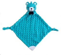 Jedno z ramion kocyka uzupełniono o miękki silikonowy gryzak, który przynosi ulgę wrażliwym dziąsłom. Supełki w rogach są łatwe do uchwycenia dla małych rączek i wspierają rozwój motoryki małej. Produkt jest certyfikowany w Czechach i spełnia standardy bezpieczeństwa dla noworodków.