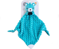 Mięciutka przytulanka-usypiacz z główką uroczego misia z miękkiego materiału minky z wypukłymi kropkami zapewni maluszkowi poczucie bezpieczeństwa, wyciszenie przed snem oraz delikatną stymulację sensoryczną. W środku misia znajduje się ciche grzechotki wspierające słuch, a w rogu miękki silikonowy gryzak przynoszący ulgę przy ząbkowaniu.