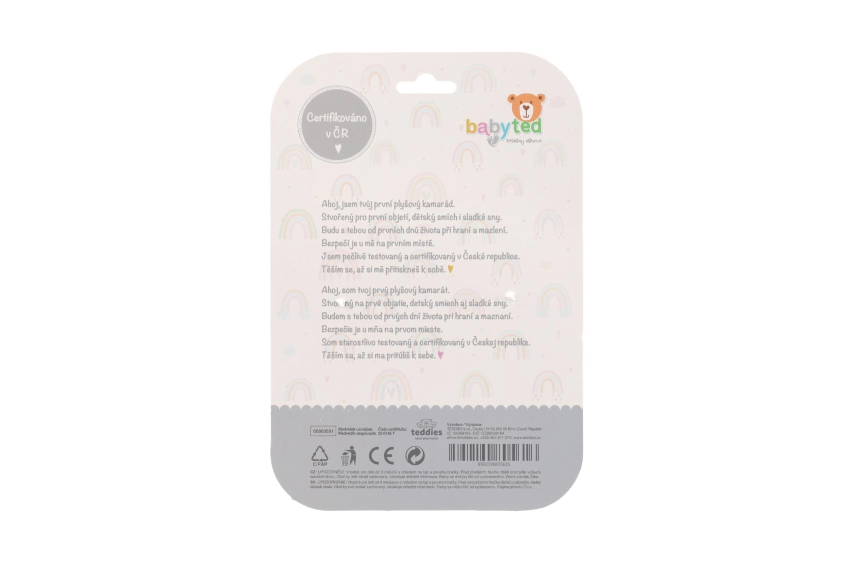 Ta pluszowa przytulanka-usypiacz BABYTED została zaprojektowana dla niemowląt już od urodzenia. Ultra miękki materiał minky z wypukłymi kropkami jest przyjemny w dotyku i dzięki kojącemu charakterowi wspiera lepszy sen. Zintegrowana grzechotka w główce misia delikatnie dźwięczy i naturalnie przyciąga uwagę dziecka.