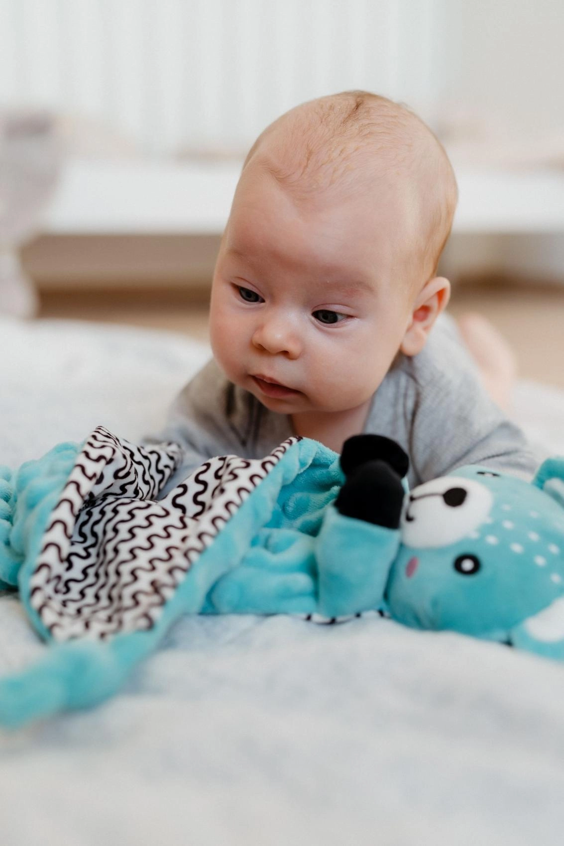 - Miękki materiał minky z wypukłymi kropkami dla stymulacji dotykowej