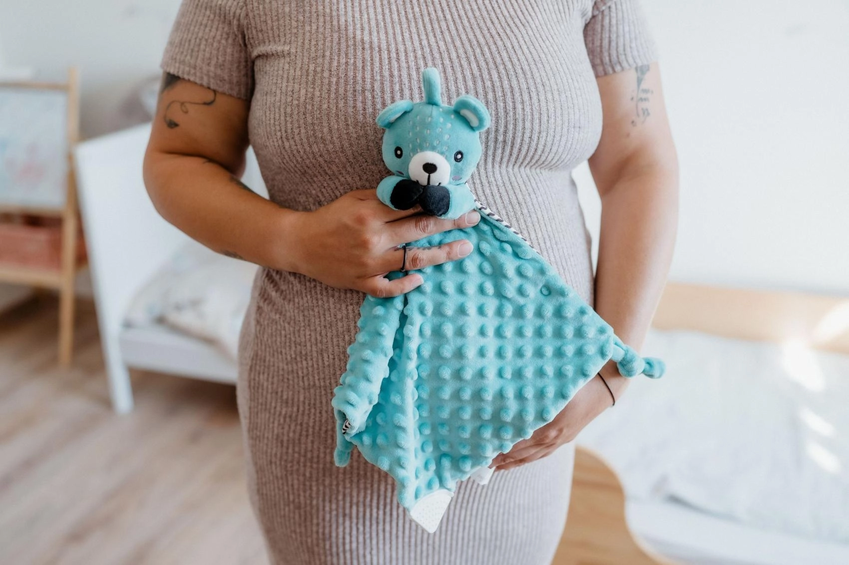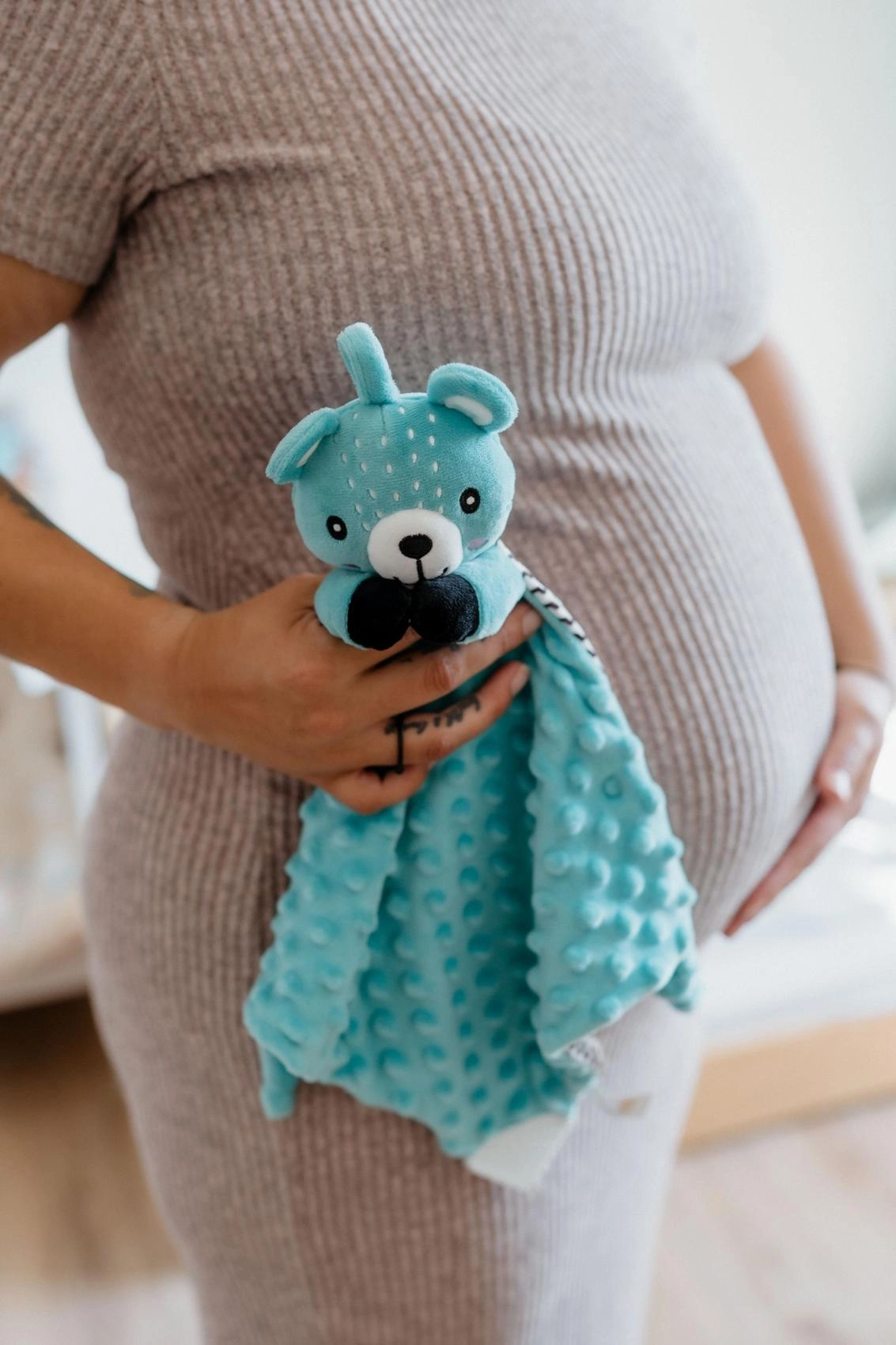 - Plusz / minky (tkanina), silikonowy gryzak