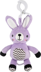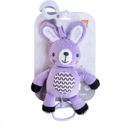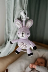 Ten wiszący pluszowy króliczek zapewnia maluszkowi ukojenie, delikatną stymulację i bezpieczną zabawę w domu i w podróży. Nakręcany mechanizm po pociągnięciu odtwarza przyjemną melodię, która pomaga stworzyć spokojne otoczenie do odpoczynku. Dzięki uniwersalnemu klipsowi zabawkę łatwo przymocujesz do wózka, łóżeczka, fotelika samochodowego lub pałąka.