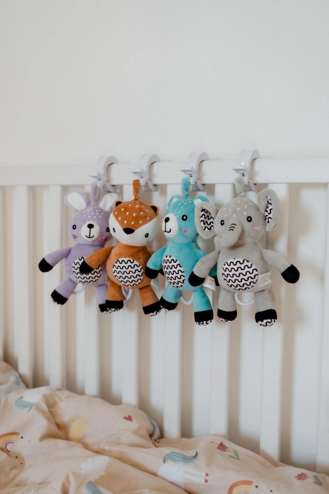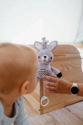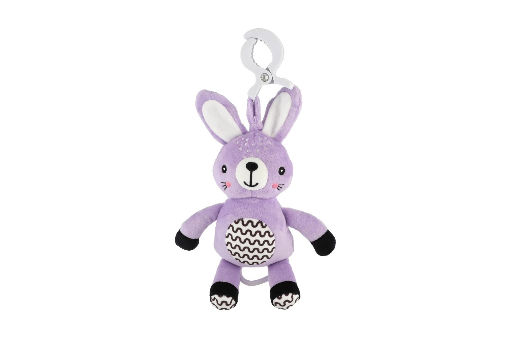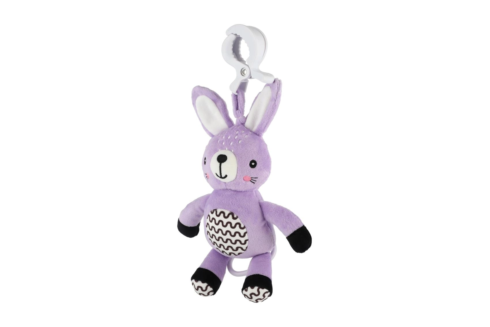 Praktyczny klips pozwala szybko przymocować króliczka do wózka, łóżeczka, fotelika samochodowego lub pałąka – zawsze pod ręką w domu i w podróży.