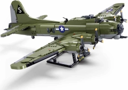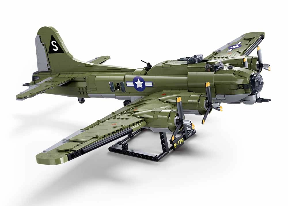 Model oferuje szereg funkcjonalnych elementów: chowane podwozie, obracające się śmigła oraz ruchome części skrzydeł i statecznika kierunku do ustawienia konfiguracji lotu lub lądowania. W zestawie znajduje się stojak z oznaczeniem B-17G oraz 3 minifigurki członków załogi z akcesoriami. Zestaw jest kompatybilny z LEGO, Cobi i Mega Bloks, więc łatwo rozbudujesz swój model o dodatkowe elementy.