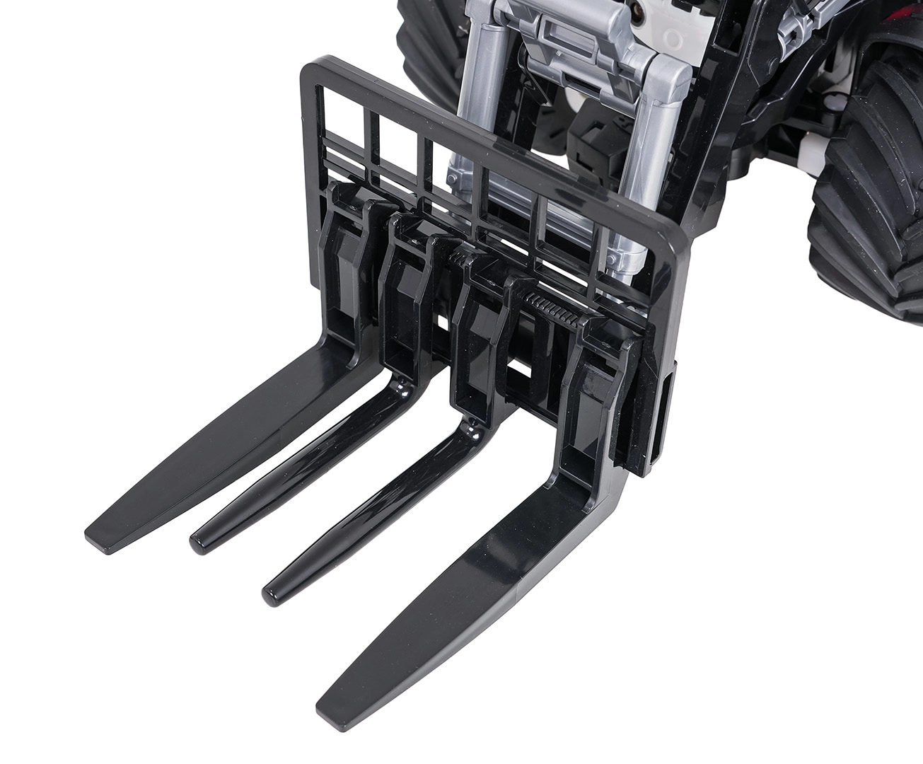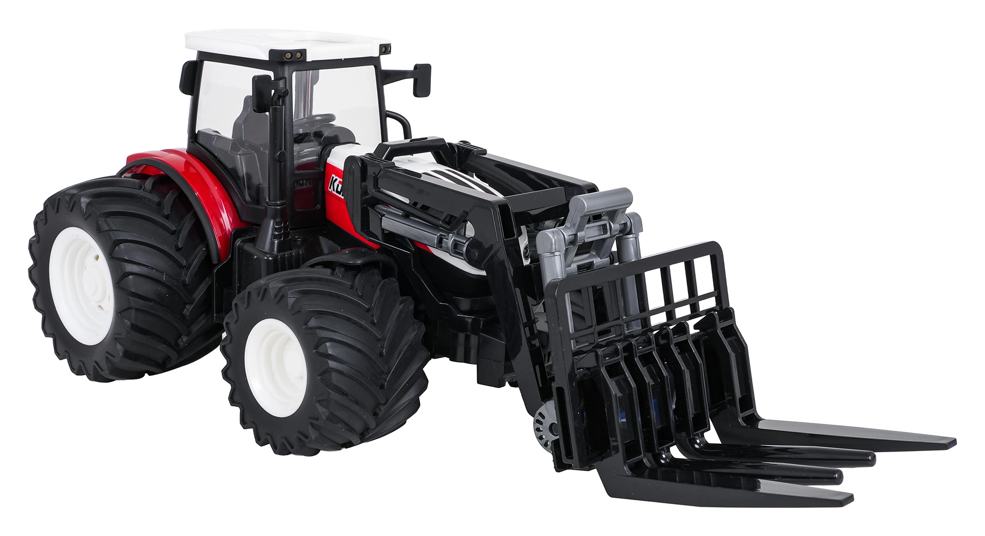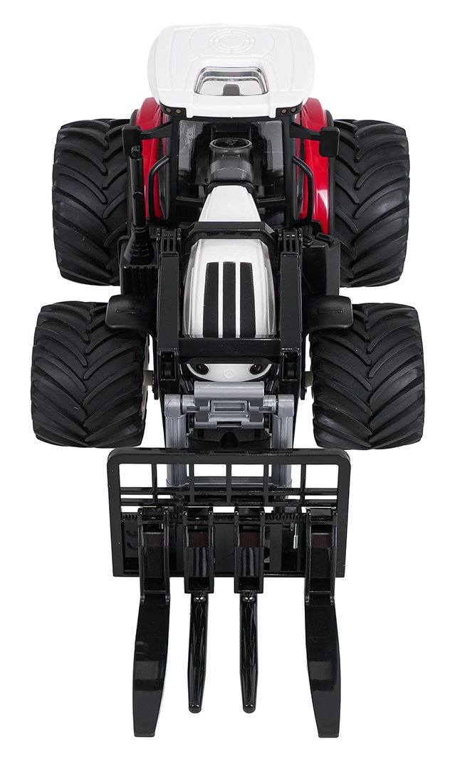 Ładowacz czołowy można ręcznie podnosić, opuszczać i przechylać, dzięki czemu dzieci mogą nabierać i przenosić drobne przedmioty. Duże gumowe koła zapewniają dobrą trakcję na różnych nawierzchniach. Praktyczne jest także automatyczne wyłączenie przy dłuższej bezczynności. Traktor jest zasilany dołączonym akumulatorem 3,7 V 500 mAh, ładowanie odbywa się przez kabel USB; pilot wymaga 2× AAA (brak w zestawie).