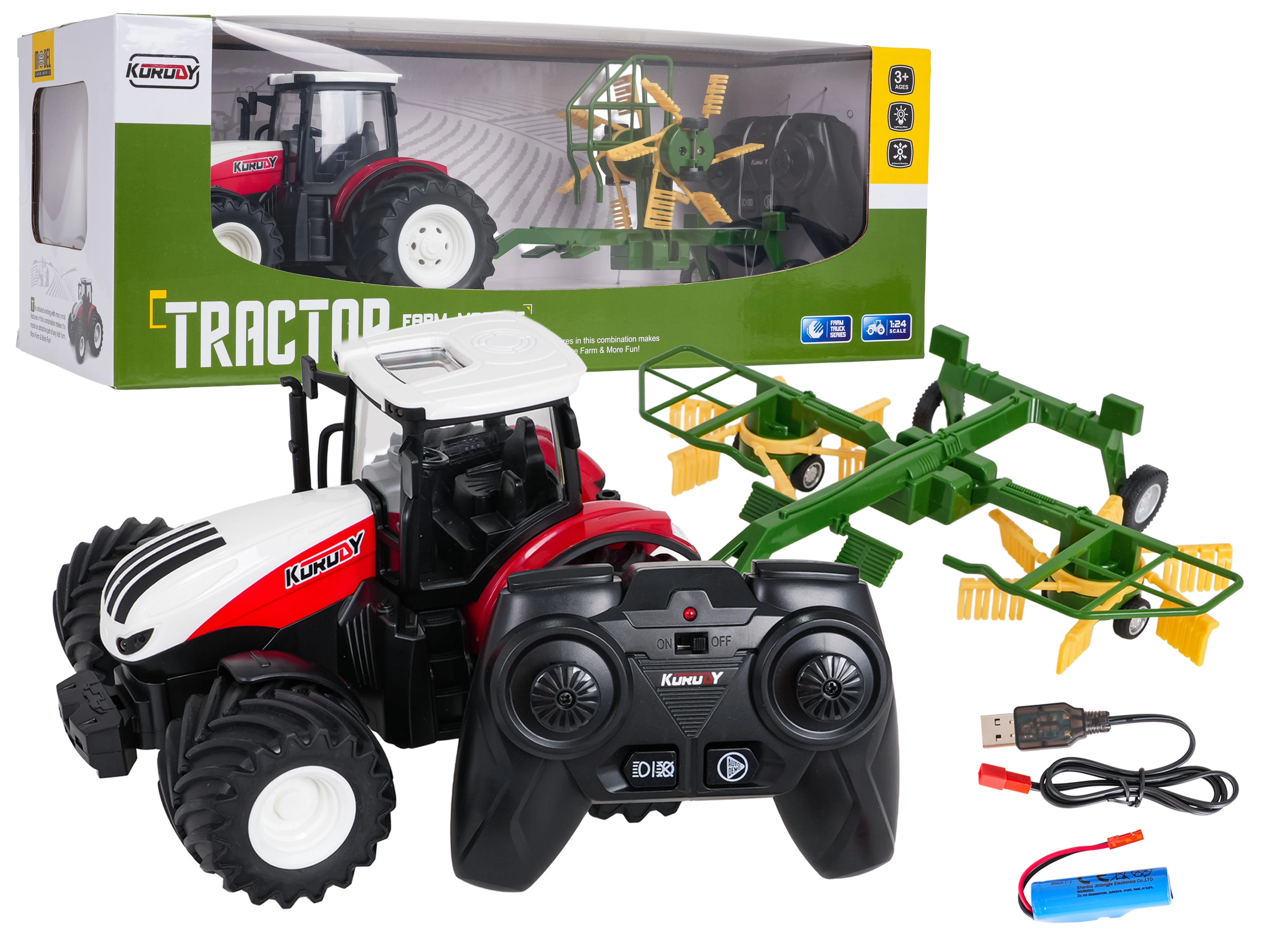 - Traktor RC z przetrząsaczem, pilot 2,4 GHz, akumulator 3,7 V 500 mAh, kabel do ładowania USB
