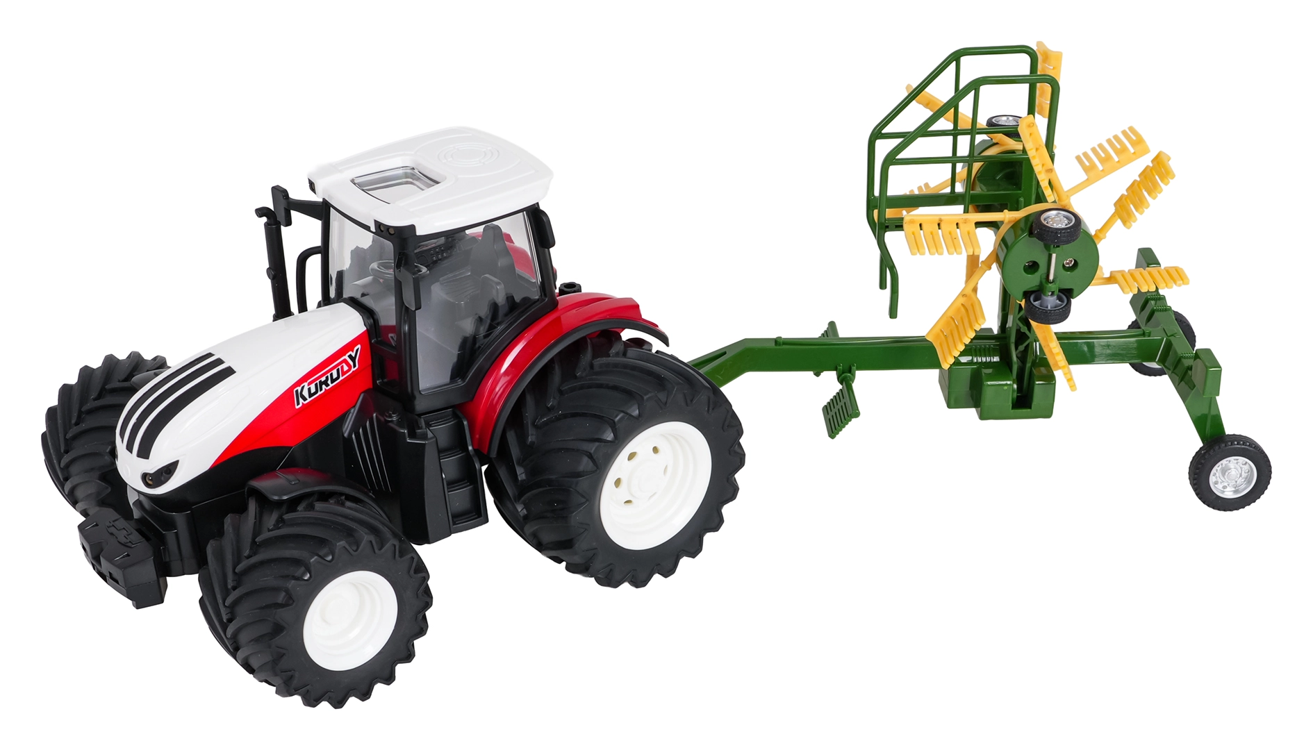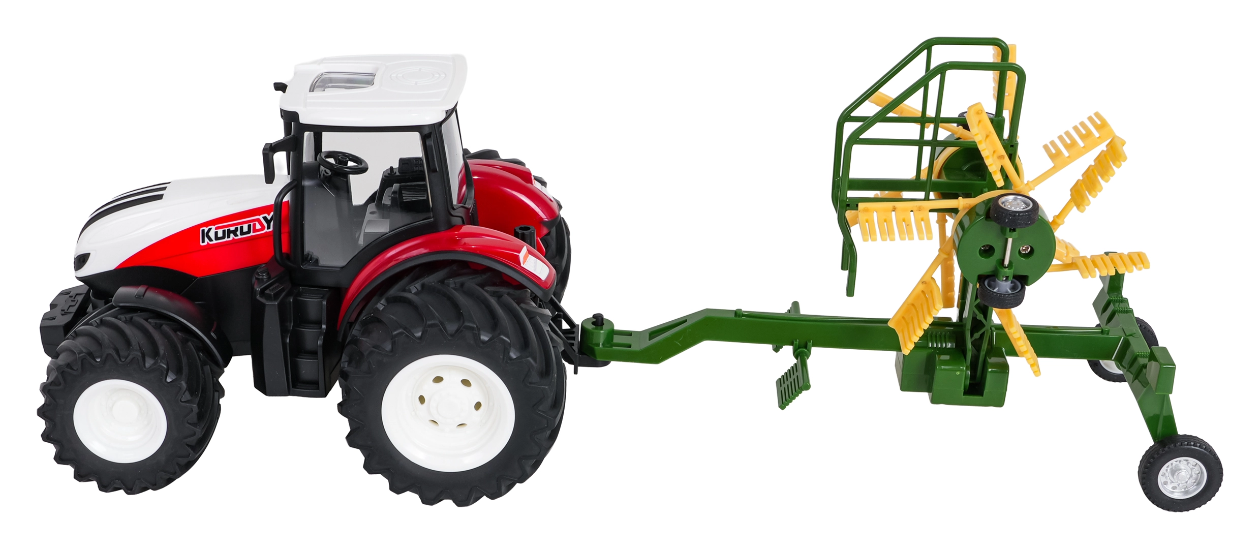 Zabawny i wytrzymały traktor RC z przetrząsaczem siana w skali 1:24 zachwyci małych farmerów od 3 roku życia. Oferuje jazdę we wszystkich kierunkach, zdalne sterowanie 2,4 GHz, przednie światła i oświetlenie kabiny oraz duże gumowe koła zapewniające świetną przyczepność. Dwukaruzelowy przetrząsacz można złożyć na bok, odłączyć, a jego rotory obracać ręcznie. Nie brakuje trybu demo do szybkiego pokazania funkcji.