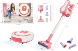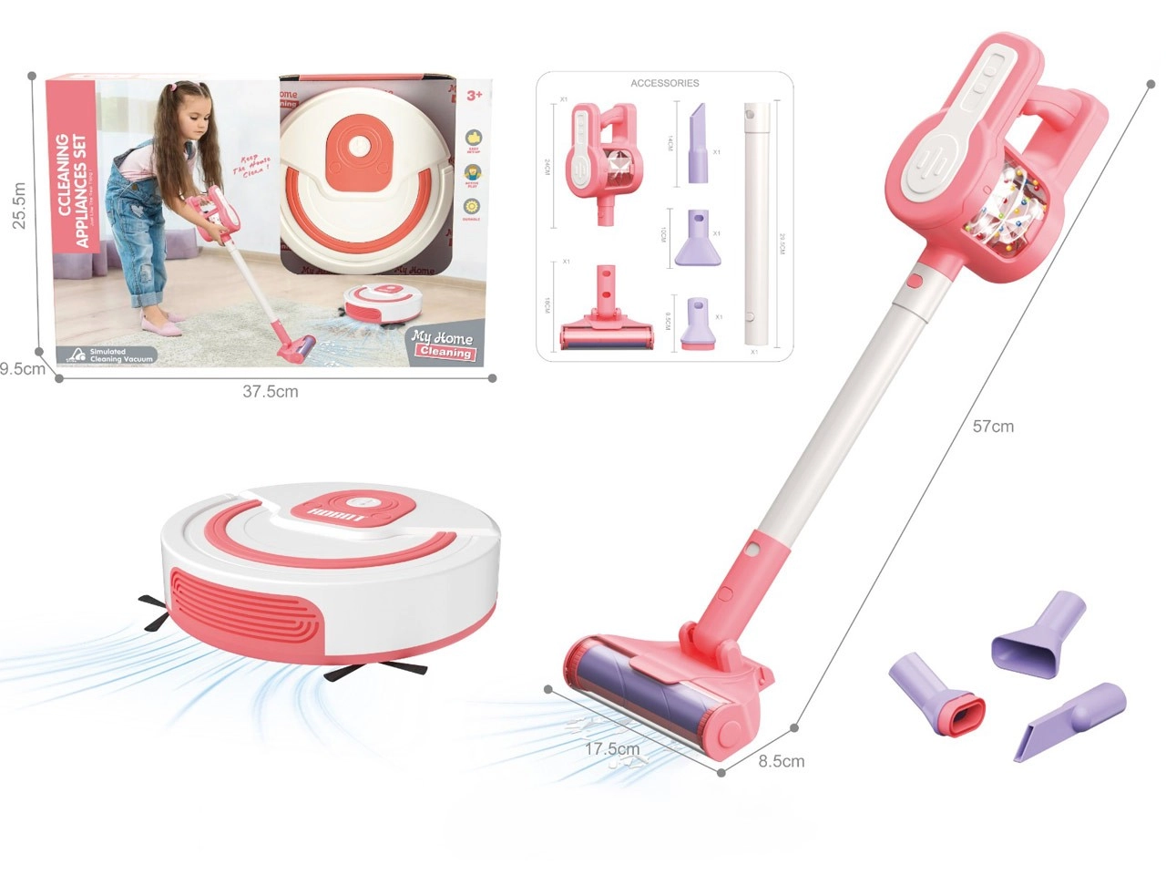 Zestaw do sprzątania dla dzieci umożliwia realistyczną zabawę w gospodarstwo domowe i motywuje dzieci do pomocy w codziennych czynnościach. Odkurzacz pionowy z przezroczystą komorą i wirującymi kuleczkami wiernie naśladuje prawdziwe odkurzanie, a robot sprzątający z efektem ssania i obracającymi się szczotkami zaciekawi każde dociekliwe dziecko.