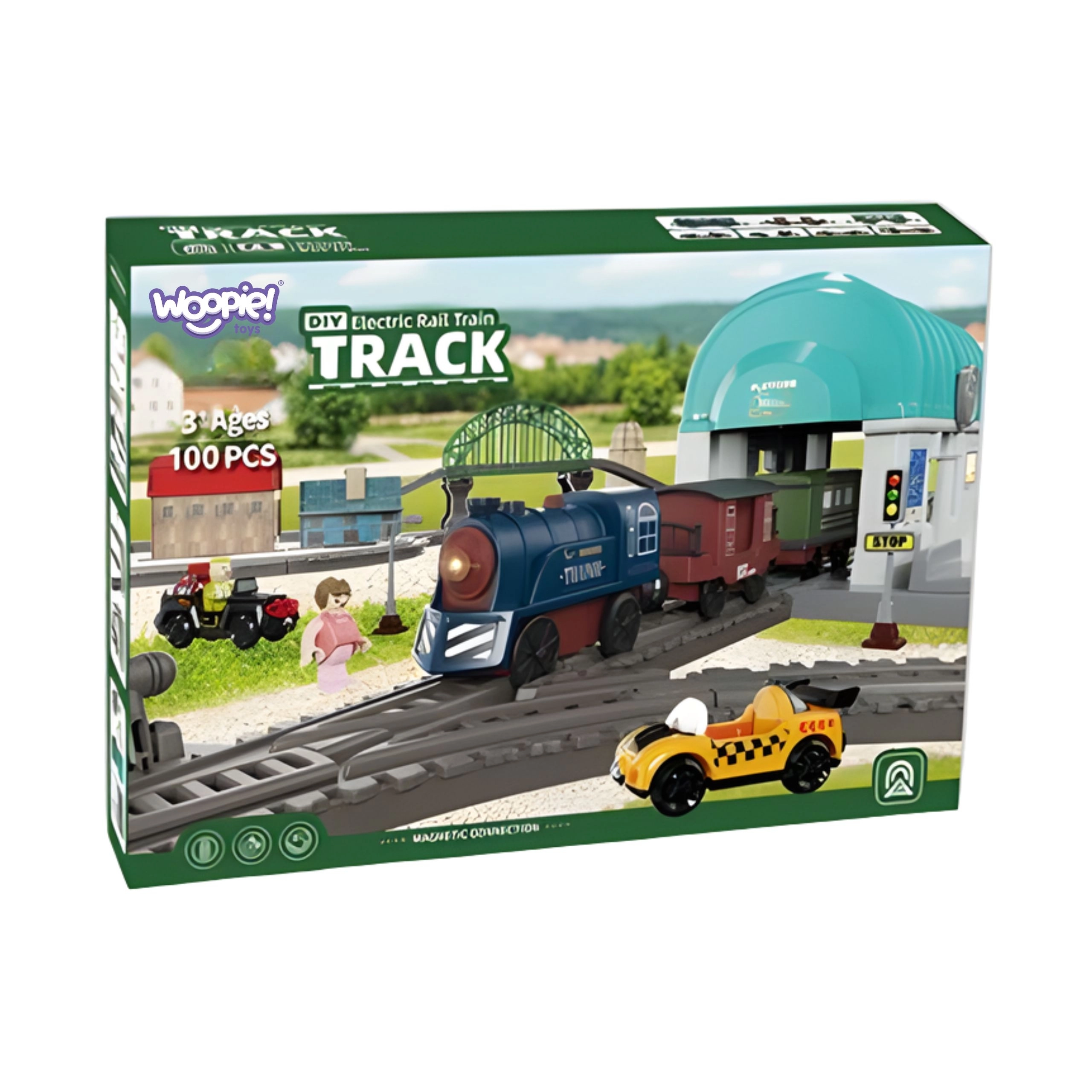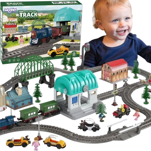 Rozbudowana elektryczna kolejka od WOOPIE przenosi dzieci w świat wyobraźni w formie miasteczka z mostem, tunelem i stacją. Lokomotywa ze światłami i dźwiękami, magnetyczne łączenie wagonów oraz 108 elementów do budowy różnorodnych tras zapewnią długie godziny zabawy i rozwój kreatywności. Łatwy montaż, bezpieczne materiały i zasilanie bateryjne ucieszą dzieci i rodziców.