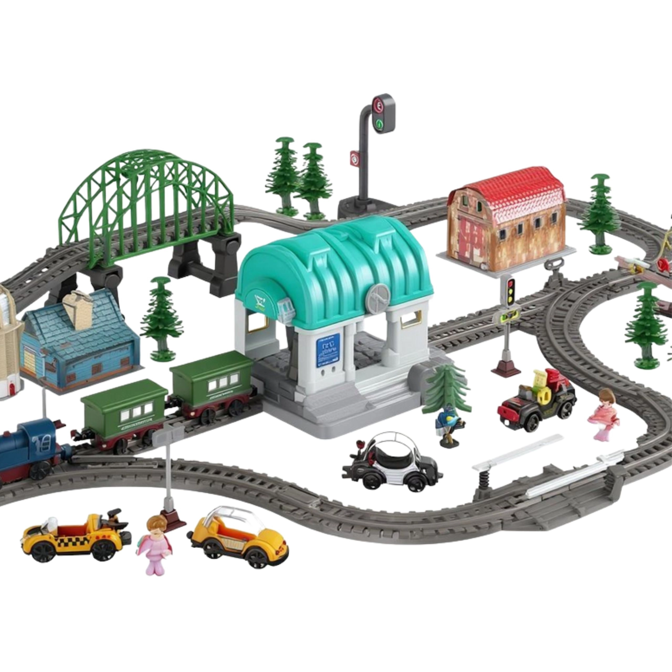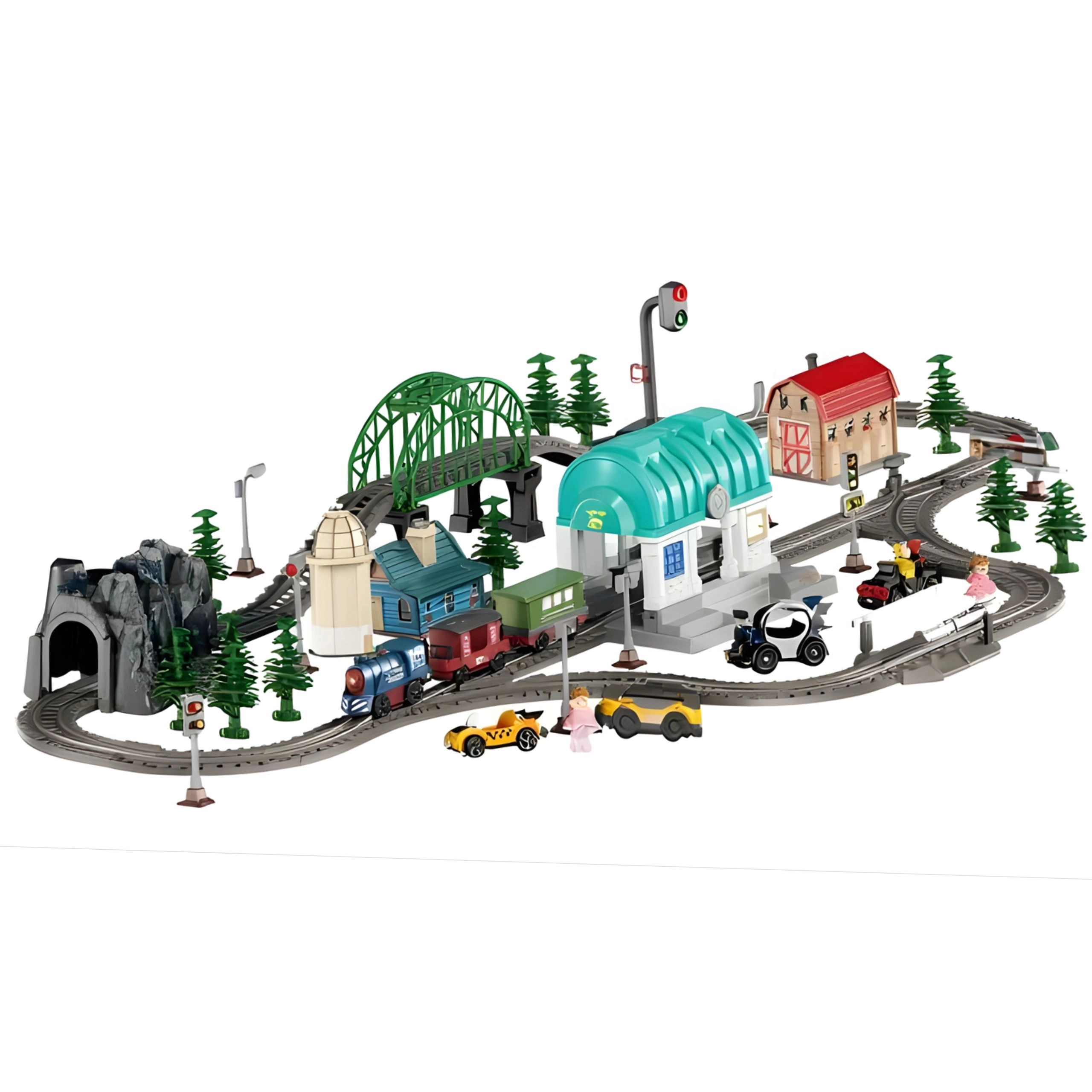 - Elektryczna lokomotywa, wagony towarowe, tory i rozjazdy, most, tunel, stacja, 4 autka, 4 figurki, drzewa, znaki drogowe, budynki i dekoracje, rogatki, sygnały, instrukcja