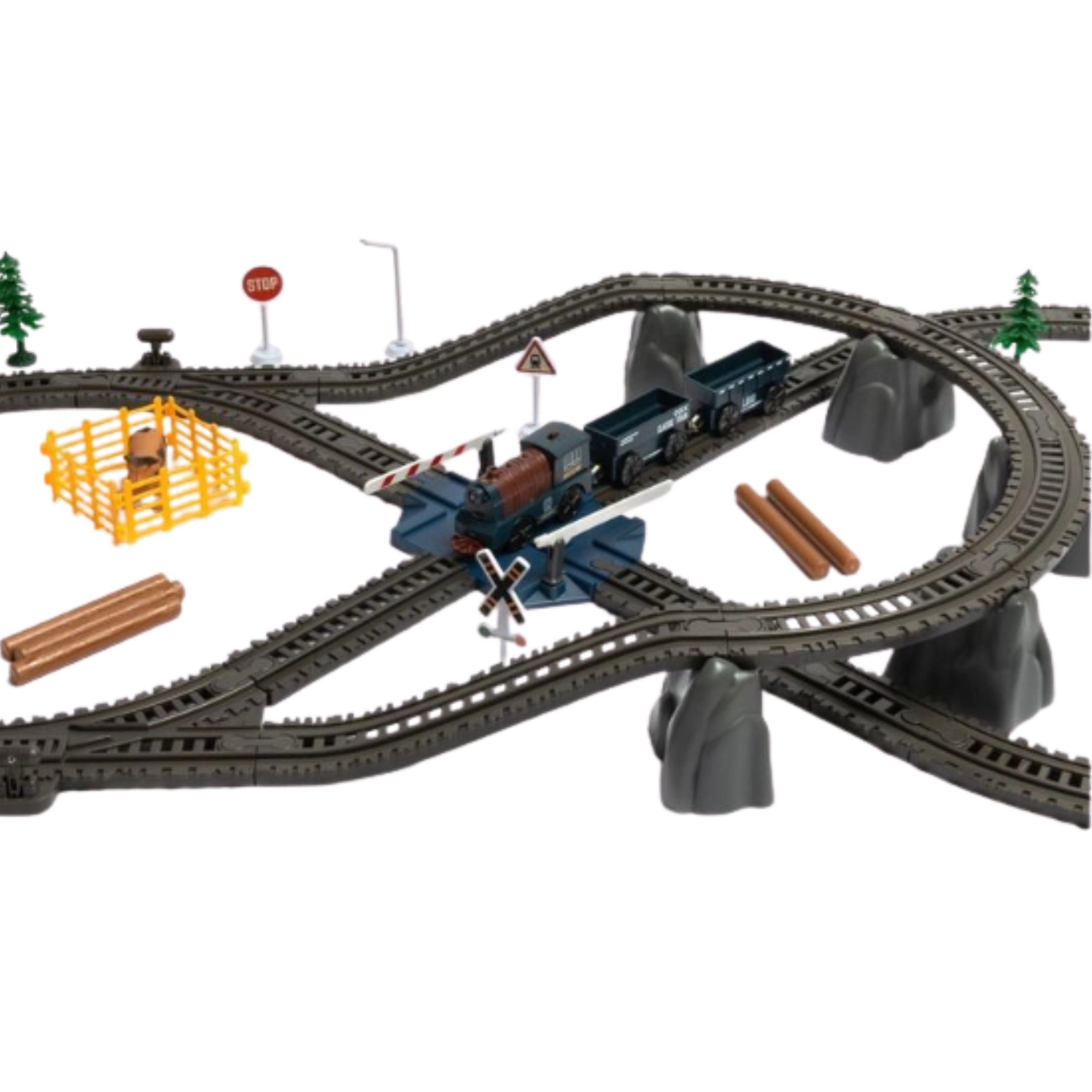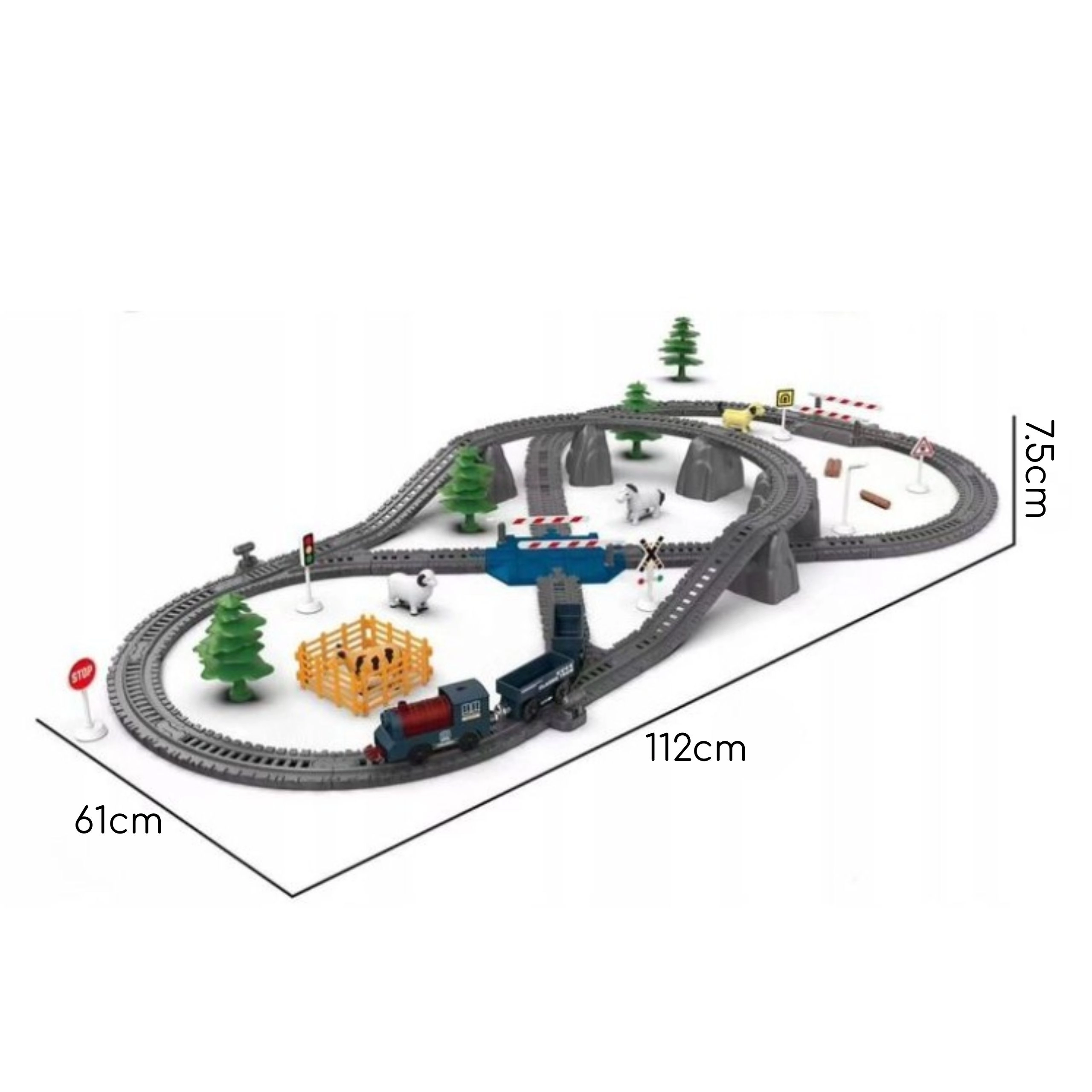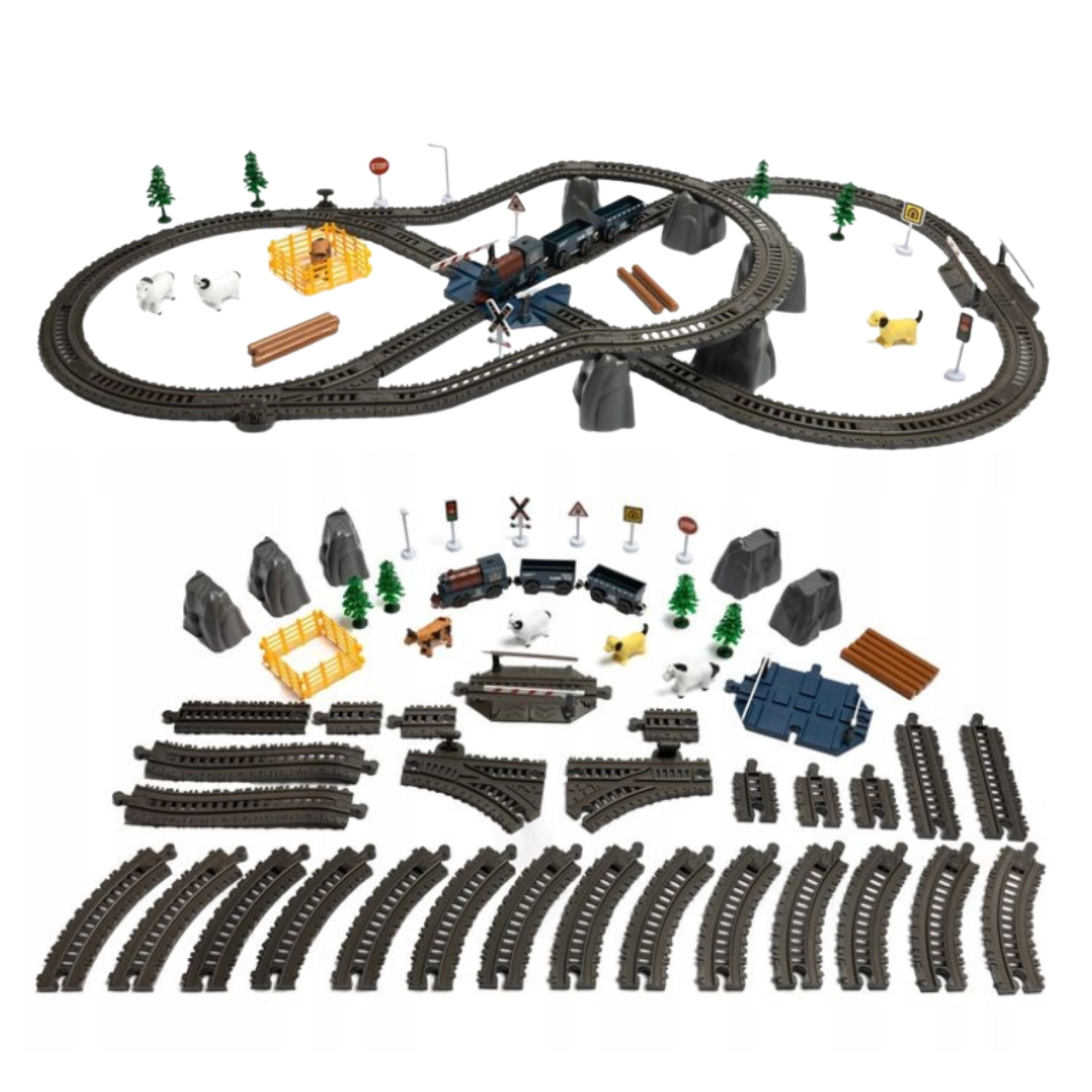 Wagony towarowe, figurki zwierząt, drzewa, znaki drogowe i przejazd z rogatkami poszerzają możliwości zabawy i pobudzają wyobraźnię.