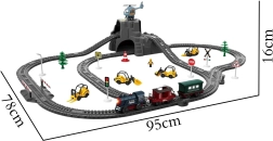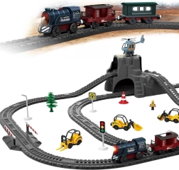 - Elektryczna lokomotywa + 2 wagony, tory, tunel, znaki, szlabany, drzewa, figurki, dekoracje, instrukcja