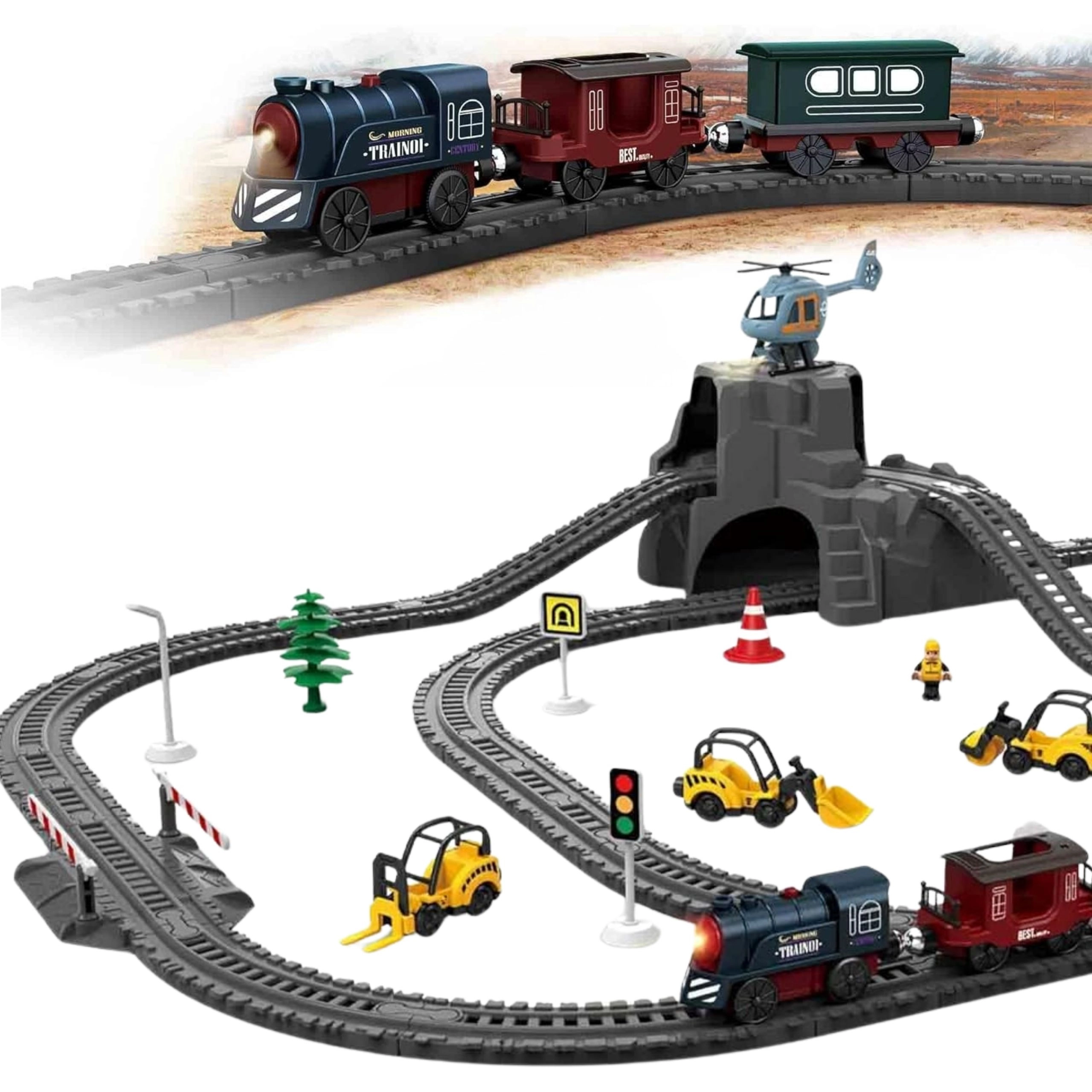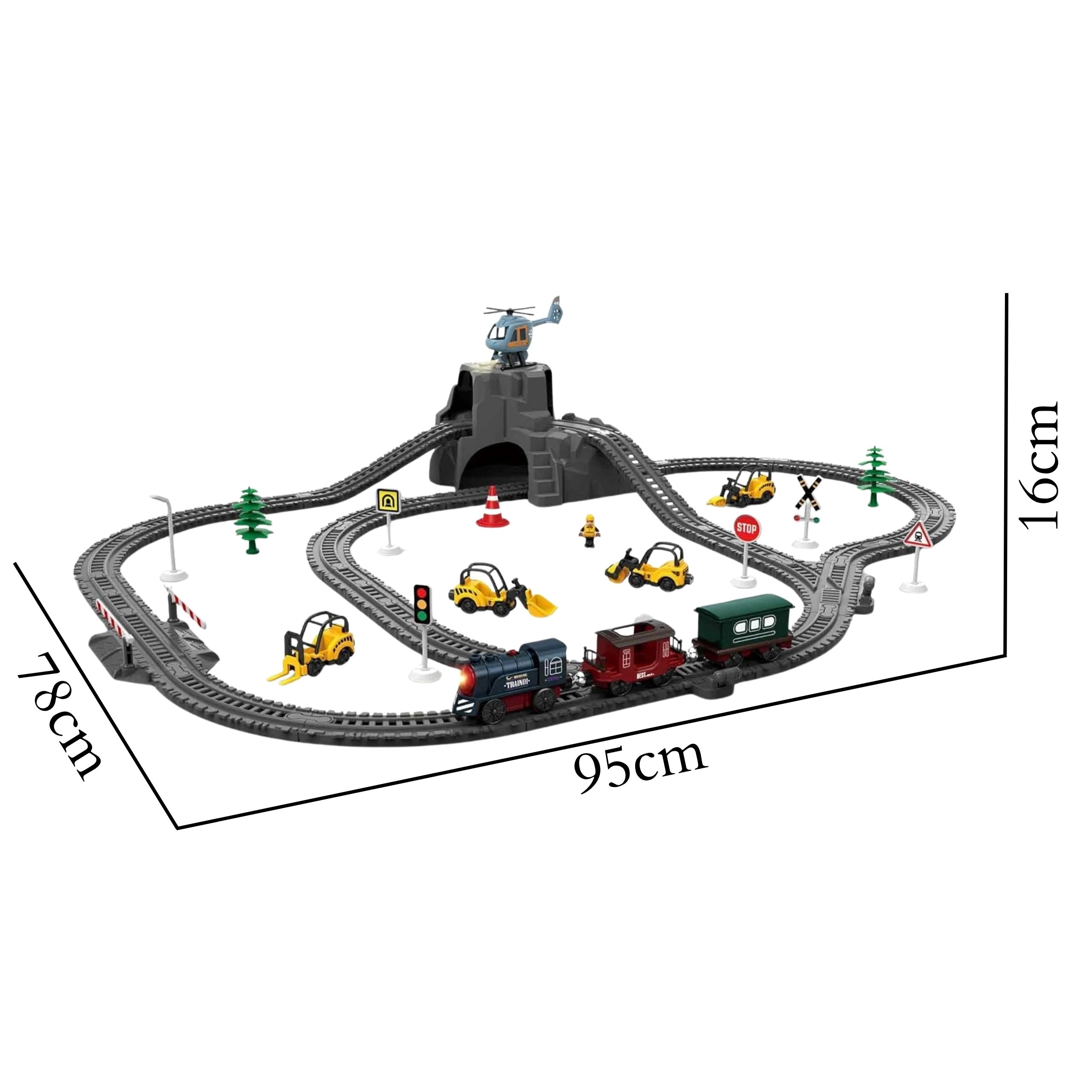 Górka z tunelem, znaki drogowe, szlabany, drzewa, figurki i pojazdy budowlane dodają zabawie napięcia i atmosfery prawdziwej kolei.