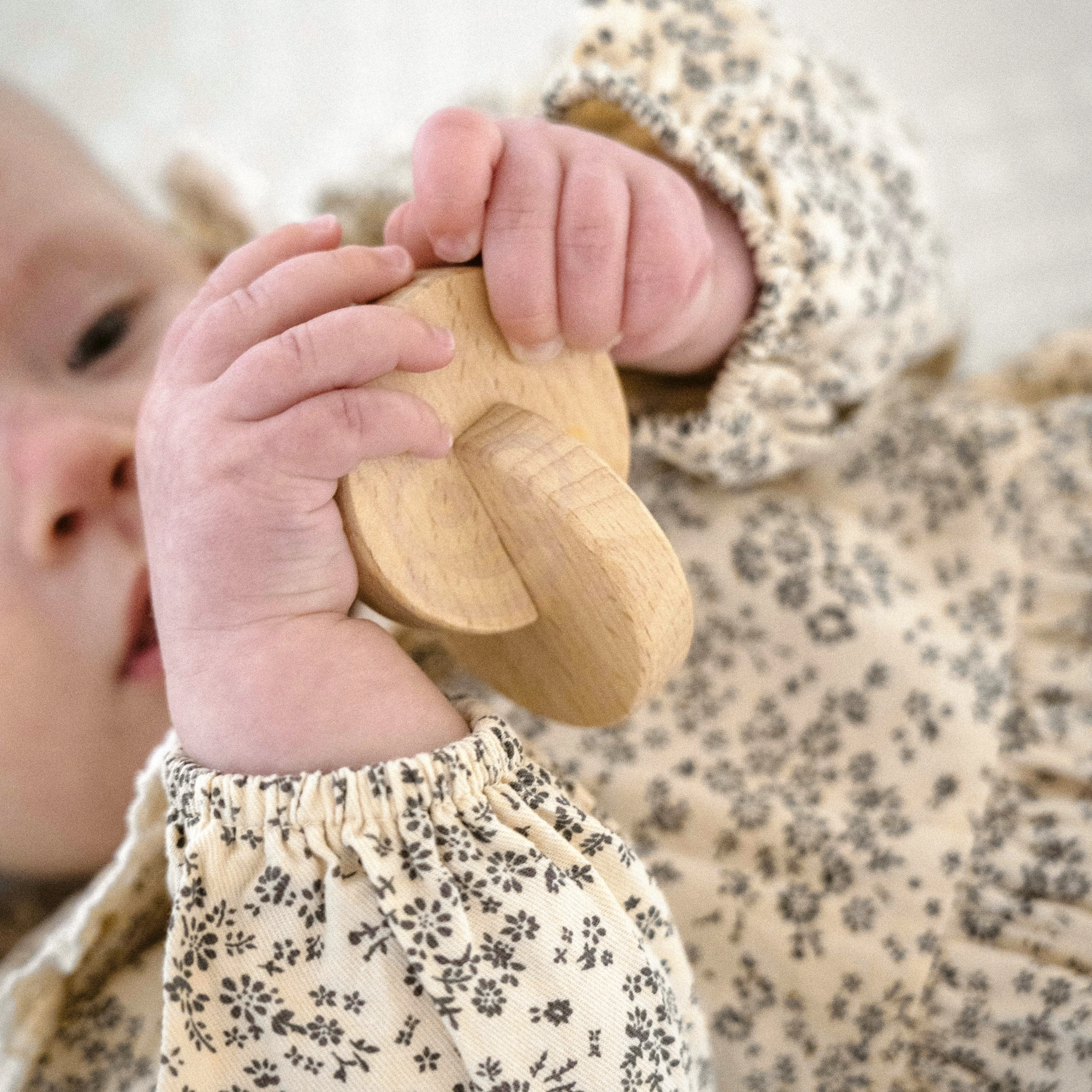 Ergonomicznie ukształtowane drewniane elementy i kolorowe, toczące się grzechotki rozwijają chwyt, koordynację ręka–oko oraz postrzeganie przyczyny i skutku podczas turlania i potrząsania.