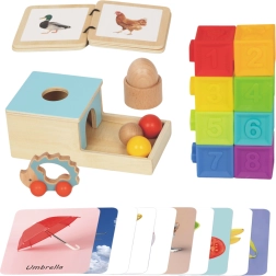 W zestawie znajdziesz drewnianą książeczkę ze zwierzętami, miękkie kostki z liczbami, pudełko do nauki stałości przedmiotu z piłeczkami, drewniane jajko z kubeczkiem, jeżyka–autko oraz zestaw kart słownych. Każda aktywność rozwija inną umiejętność: małą motorykę, rozpoznawanie kształtów i liczb, słownictwo oraz percepcję wzrokowo–pamięciową.