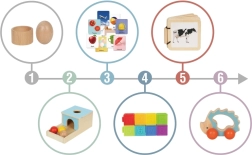 Kompletny zestaw dla najmłodszych od 7–8 miesięcy, łączący zasady Montessori z bogatą stymulacją sensoryczną i treningiem małej motoryki. W jednym opakowaniu otrzymujesz 6 sprytnych zabawek z bezpiecznych i trwałych materiałów, które rozwijają wzrok, dotyk i słuch, wspierają logiczne myślenie oraz koordynację ręka–oko. W zestawie znajduje się także przewodnik dla rodziców ułatwiający proste i wartościowe zabawy.
