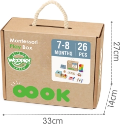 Ten montessoriański box 6w1 marki WOOPIE oferuje różnorodne aktywności do codziennego odkrywania. Drewniane elementy z certyfikatem FSC, miękkie silikonowe klocki oraz karty obrazkowe tworzą spójny program wczesnej stymulacji, który wspiera naturalną ciekawość i samodzielność dziecka.