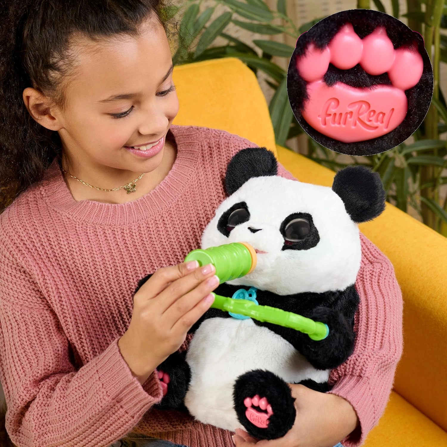 W zestawie znajduje się butelka i gałązka bambusa. Przyłożone do pyszczka uruchamiają realistyczne dźwięki picia i chrupania.