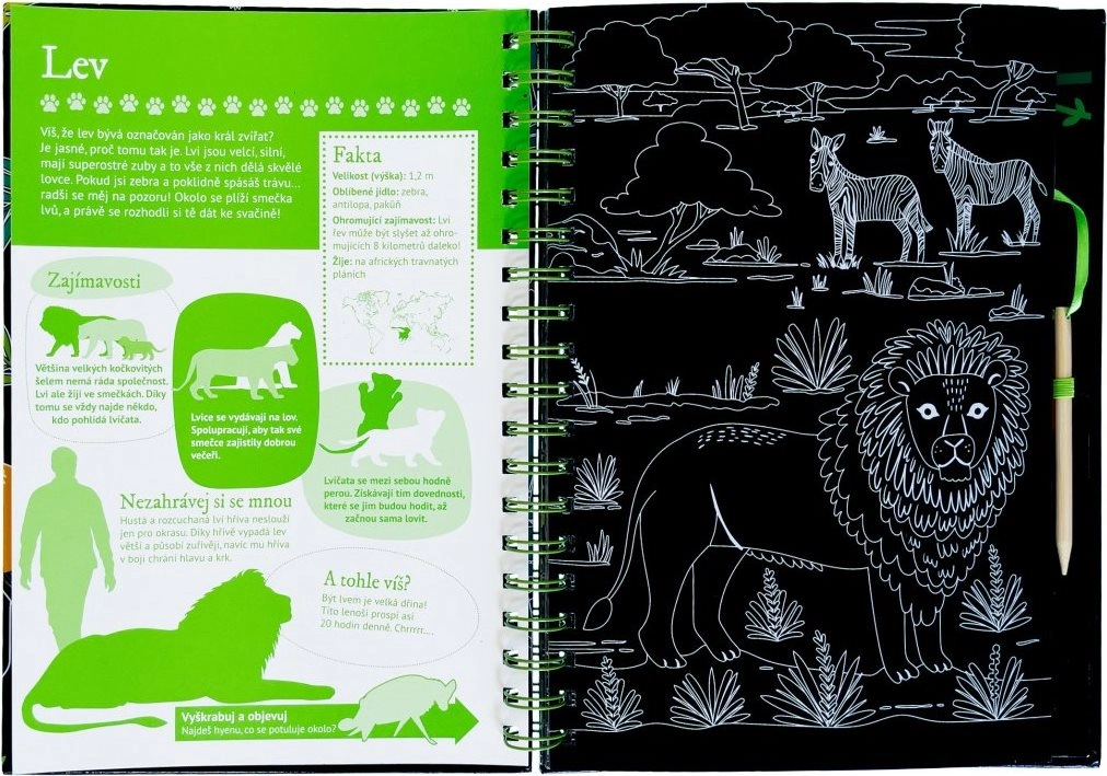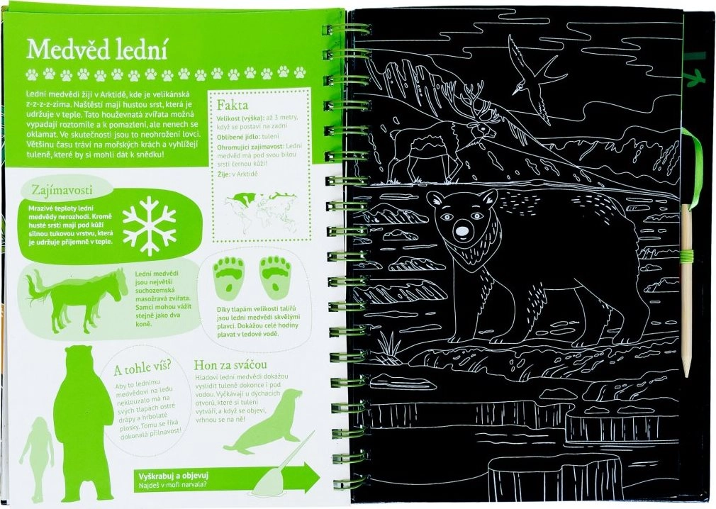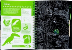 Ta pomysłowa książka podzielona jest na dwie części – pierwsza przynosi przegląd zwierząt z wieloma ciekawostkami i faktami, uzupełnionymi o obrazy do wydrapywania, które zachwycą dzieci swoją zabawową formą. Druga część oferuje interaktywne zadania, takie jak quizy, dopasowywanie, wyszukiwanie, rysowanie i uzupełnianie, dzięki którym dzieci przećwiczą nowo zdobytą wiedzę i będą się bawić przez długie godziny.