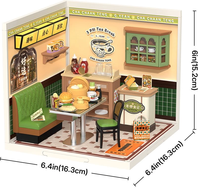 Odkryj urok tradycyjnej hongkońskiej kawiarni w miniaturze z modelem Rolife domek DIY: hongkońska kawiarnia. Zestaw z 114 elementami i oświetleniem LED oferuje łatwe składanie (poziom trudności 1/5) w około 1 godzinę i zachwyca autentycznymi detalami, takimi jak zielona skórzana kanapa, wózek kelnerski oraz kultowe przysmaki, w tym dimsum, bułeczki ananasowe i herbata mleczna.