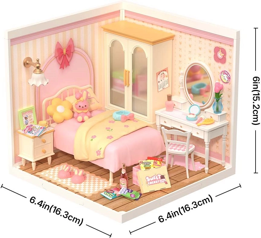 Ta urocza mini sypialnia w pastelowych tonach oferuje wszystko, co docenią miłośnicy miniatur: łóżko z tekstyliami, toaletkę z lustrem, stolik nocny, zabudowaną szafę oraz mnóstwo drobnych dodatków. Ciepłe oświetlenie LED tworzy przyjemną atmosferę i podkreśla dopracowanie mebli oraz dekoracji.