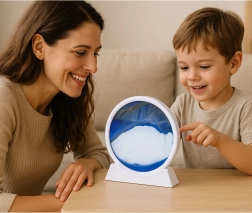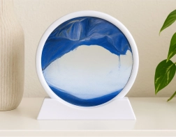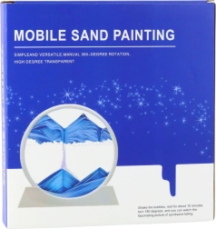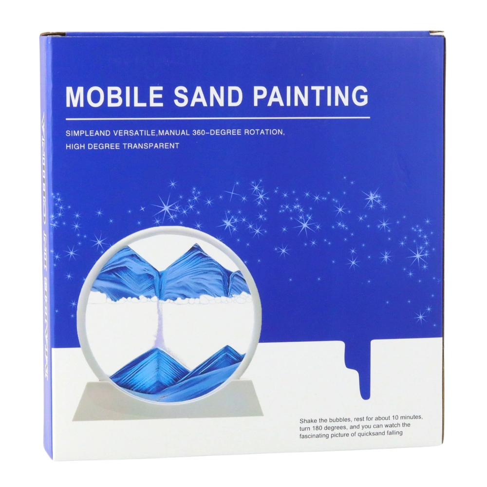 Elegancka dekoracja z efektem 3D ruchomego piasku w białej, okrągłej ramie zapewnia kojące, antystresowe doznania. Po obrocie o 360° piasek powoli opada, tworząc niepowtarzalne krajobrazy – góry, wydmy i fale. Idealna do salonu, biura, sypialni i gabinetu.