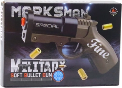 Mini pistolet MARKSMAN FINE w brązowo‑czarnym wykończeniu jest idealny do dynamicznej zabawy dla dzieci w domu i na świeżym powietrzu. Wytrzymałe plastikowe wykonanie, kompaktowe wymiary 13,5 cm i prosta obsługa sprawiają, że to świetny towarzysz do rozwoju koordynacji, refleksu i zręczności.