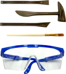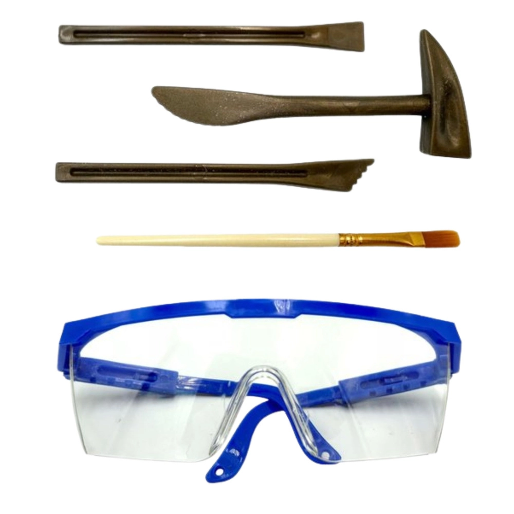 - blok gipsowy, ukryty szkielet (losowo 1 z 8), młoteczek, dłuta, pędzelek, gogle ochronne