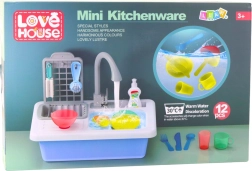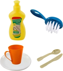 - Zlew z kranem i obiegiem wody, zielony talerzyk, różowa miska, 3× kubeczek, nóż, łyżka, widelec, szczotka do naczyń, skrobak/łopatka, butelka „płynu do naczyń”