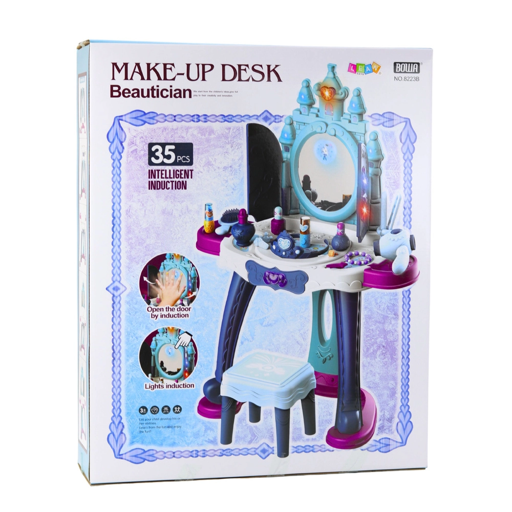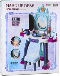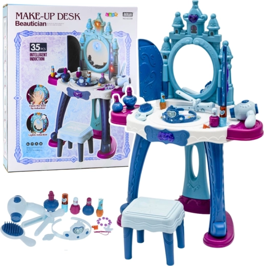 Interaktywny toaletkowy stolik Lodowej Księżniczki przenosi dzieci w atmosferę prawdziwej królewskiej buduaru. Po zbliżeniu się otwierają się drzwiczki i ukazuje się lustro, na którym pojawiają się postacie księżniczek. Lampki LED umieszczone na górze, po bokach lustra oraz na drzwiczkach tworzą delikatne podświetlenie, a magiczne melodie pobudzają wyobraźnię i zachęcają do zabawy.