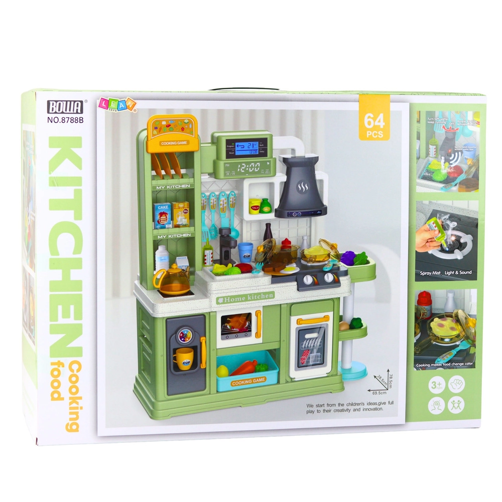 Ta dopracowana kuchnia tworzy atmosferę prawdziwej kuchni: realistyczne palniki wydają dźwięki gotowania i smażenia, podświetlany okap dodaje efektu nowoczesnej zabudowy, a zlew z obiegiem wody działa na ruch ręki lub po przekręceniu kurka. Specjalne produkty zmieniają kolor po podgrzaniu, co pobudza ciekawość i naśladowanie prawdziwych czynności kucharskich.