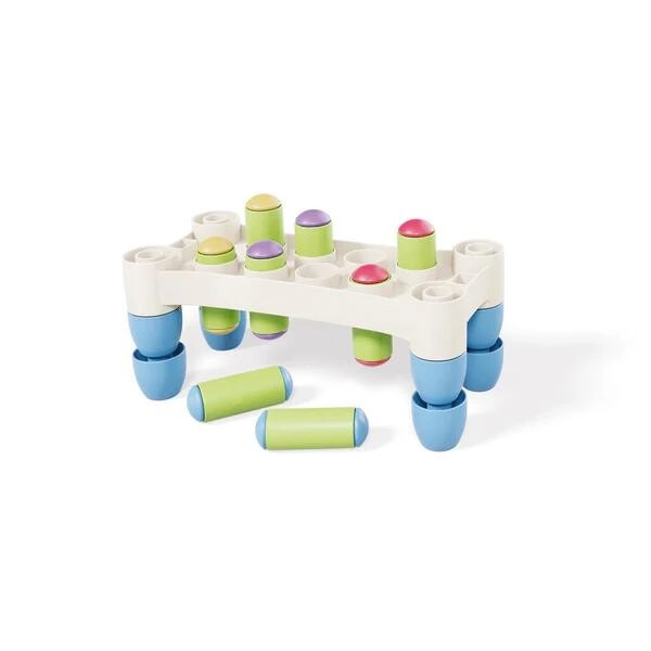 Podstawa z wieloma otworami i stabilnymi nóżkami utrzymuje elementy na miejscu. Po wbiciu wystarczy odwrócić zabawkę i zabawa trwa bez przerwy.
