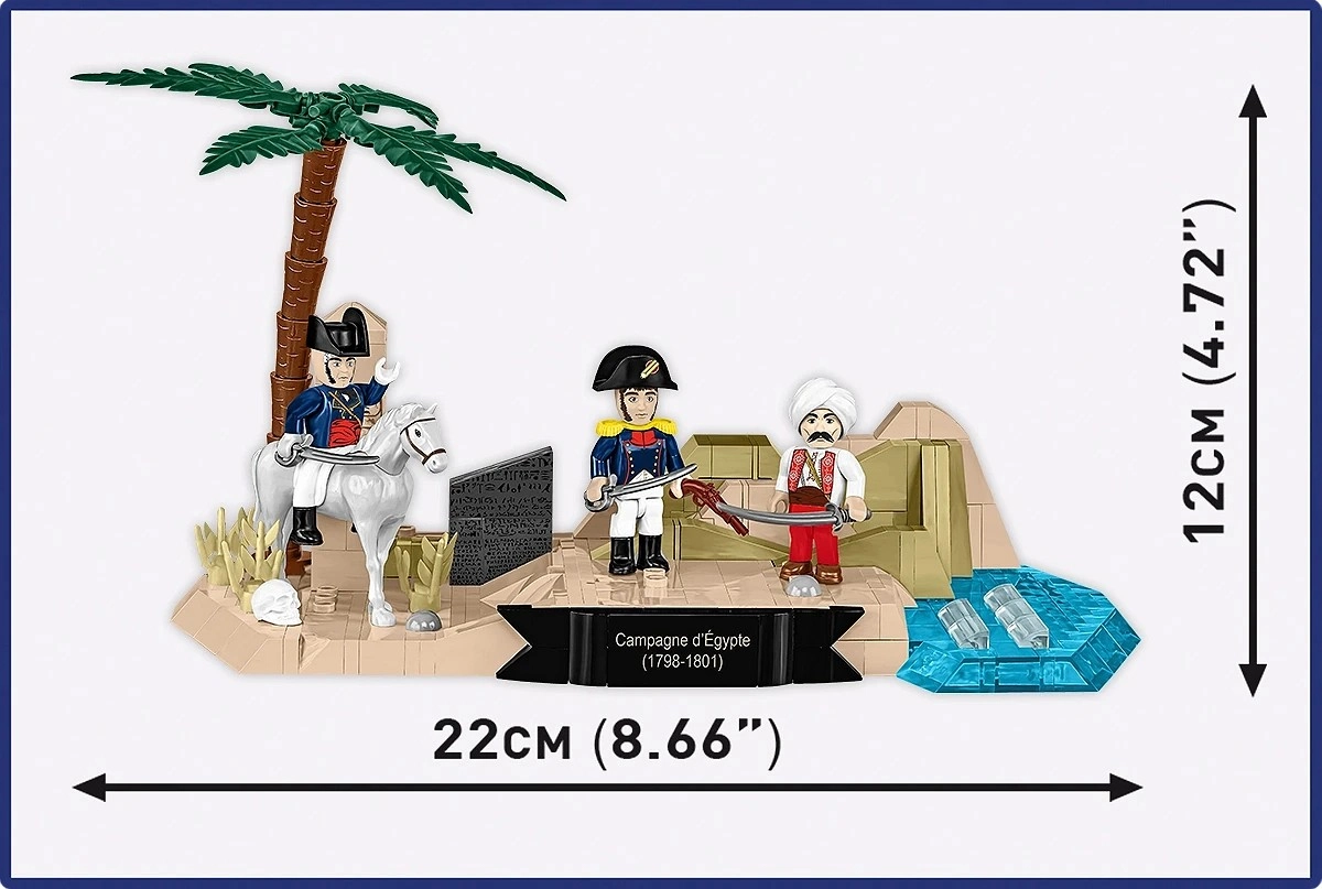 Poznaj egzotyczny rozdział dziejów napoleońskich z zestawem COBI Campagne d’Égypte (1798–1801). Zbuduj mini dioramę z pustynią, palmą i Kamieniem z Rosetty, uzupełnioną o detalne minifigurki francuskich oficerów oraz mameluka na koniu. Wszystkie elementy mają wysokiej jakości nadruki bez naklejek, a intuicyjna instrukcja ułatwia budowę. Zestaw jest kompatybilny z innymi klockami.