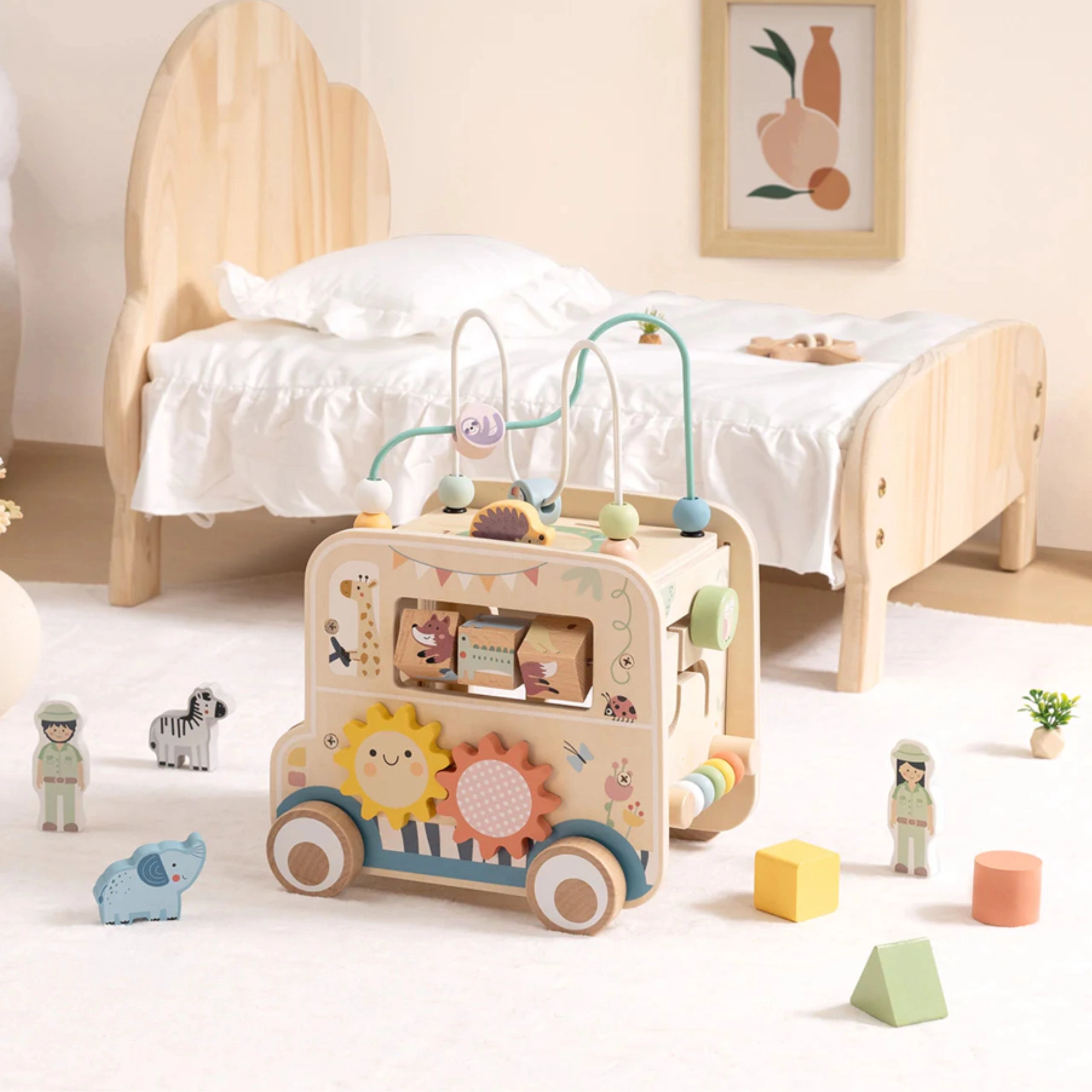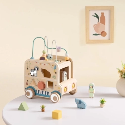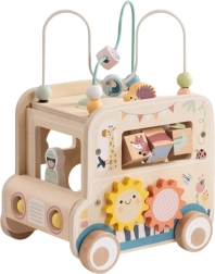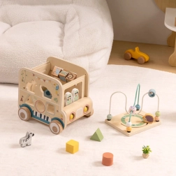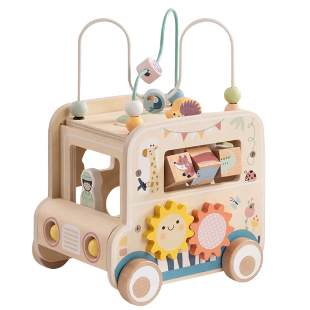Drewniana aktywna kostka/samochód safari oferuje dzieciom niezliczone możliwości odkrywania. Od zdejmowanej pętli motorycznej z koralikami, przez labirynt i zębatki, po obrotowe klocki ze zwierzątkami – każda strona to nowe wyzwanie. Projekt w stonowanych kolorach i gładkie wykończenie zapewniają bezpieczną zabawę oraz rozwój umiejętności.